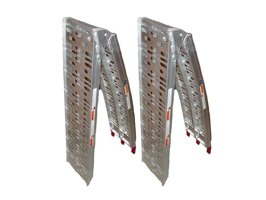 Hliníkové nájezdové rampy pro přesun zahradního traktůrku na přívěsný vozík nebo jiné vyvýšené místo. Rampy jsou lehké a lze je jednoduše přenášet. Žebrovaný povrch zaručuje dobrou přilnavost. Zahnutý konec napomáhá stabilizaci rampy při zatížení. Rampy se dají skládat a nezabírají tolik prostoru.