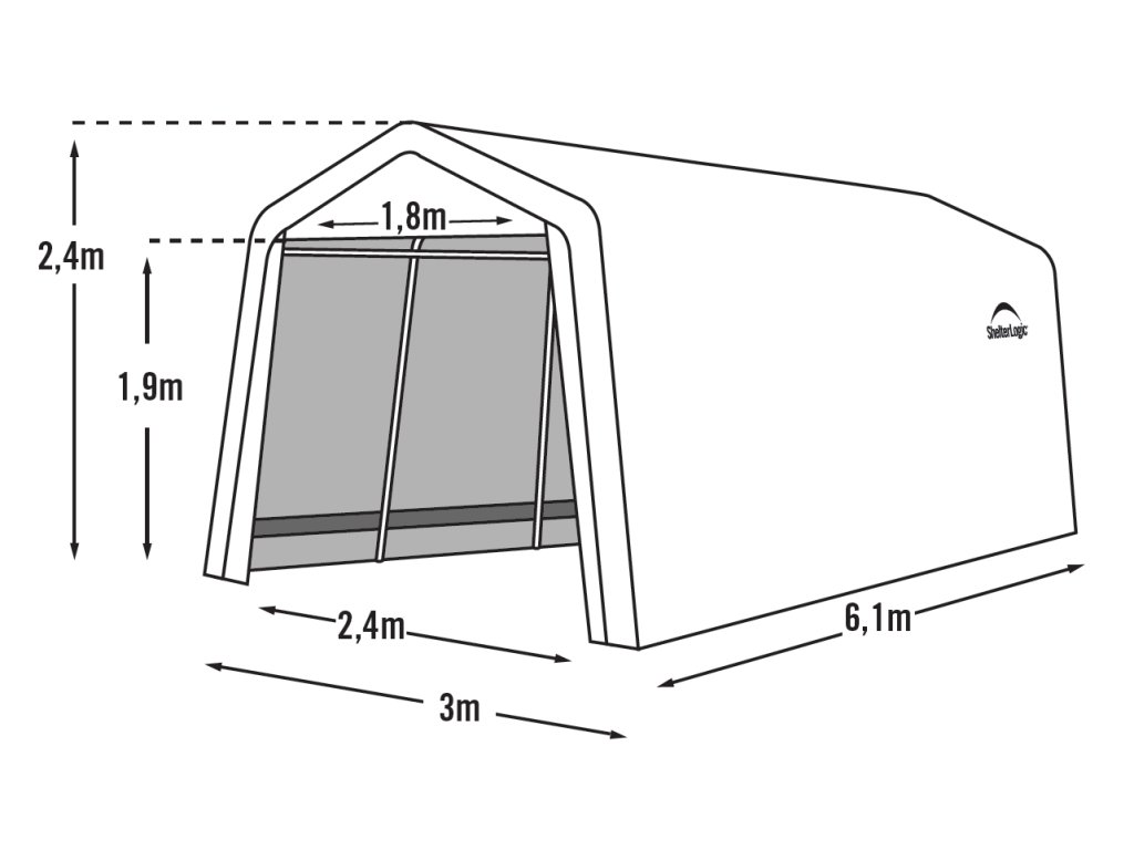 Velmi kvalitní a pevná plachtová garáž SHELTERLOGIC 3 x 6,1 m vytvoří rychlé, kryté garážové stání pro váš automobil, motocykl, čtyřkolku nebo zahradní techniku, ale může sloužit i pro uskladnění sena, slámy a krmení pro hospodářská zvířata. Plachtová garáž je široká 370 cm (přední strana s vstupním otvorem) a 610 cm dlouhá. Spolehlivě chrání před deštěm, kroupami, ptačím trusem, pylem a UV zářením. Zastavěná plocha činí 18,3 m2.