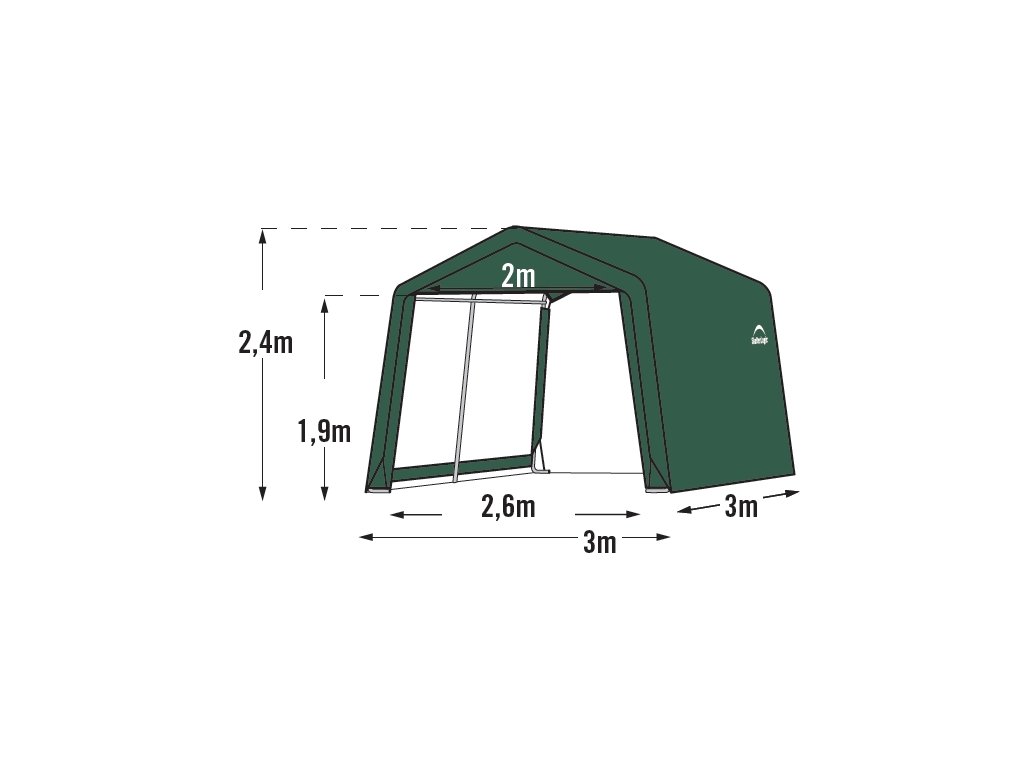 Prostorný, kvalitní a pevný plachtový přístřešek SHELTERLOGIC 3 x 3 m vytvoří rychlé, kryté garážové stání pro váš automobil, motocykl, čtyřkolku nebo zahradní techniku, ale může sloužit i pro uskladnění sena, slámy a krmení pro hospodářská zvířata. Přístřešek je široký 300 cm (přední strana s vstupním otvorem) a 300 cm dlouhý. Spolehlivě chrání před deštěm, kroupami, ptačím trusem, pylem a UV zářením. Zastavěná plocha činí 9 m2.