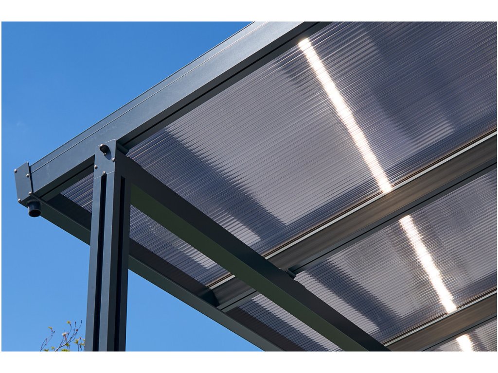 Zastřešení je řešeno kvalitními bronzovými akrylátovými deskami s dvojitými stěnami Guttagliss DUAL 16 mm, který v ČR prošel náročnými testy ve státem akreditovaných zkušebnách jako stavební materiál. Akrylát je opatřen jednostrannou UV ochranou. To vše zaručuje vysokou odolnost proti nepříznivému počasí. Odolá zatížení sněhem až do 150 kg / m2.