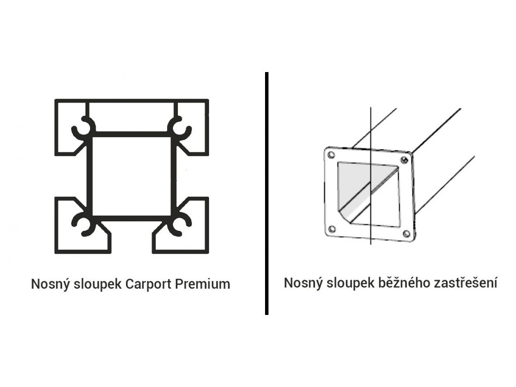 Robustní rámová konstrukce přístřešku je vyrobena z vysoce odolné hliníkové slitiny o síle profilů 2-4 mm. Je opatřena antikorozním nástřikem práškovým lakováním v bílé barvě. Díky tomu je přístřešek vysoce odolný vůči rezavění, plísním a mechům a je v podstatě bezúdržbový. Podpěry a nožky jsou z 2 mm galvanizované oceli a jsou individuálně nastavitelné. Pro zvýšení ochrany vašeho auta lze ke Carport Premium A dokoupit příslušenství, jako je boční či zadní stěna. V konstrukci carportu jsou připraveny profilové drážky, do kterých stačí stěny zasunout.