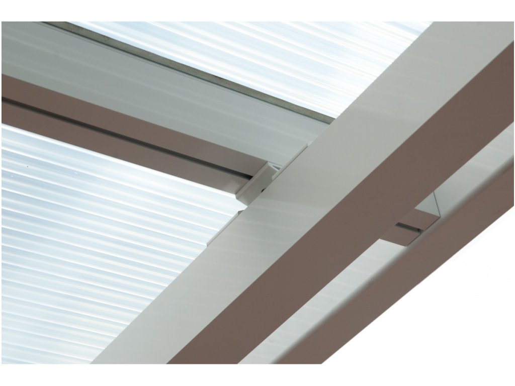 Zastřešení je řešeno kvalitními čirými akrylátovými deskami s dvojitými stěnami Guttagliss DUAL 16 mm, který v ČR prošel náročnými testy ve státem akreditovaných zkušebnách jako stavební materiál. Akrylát je opatřen jednostrannou UV ochranou. To vše zaručuje vysokou odolnost proti nepříznivému počasí. Odolá zatížení sněhem až do 150 kg / m2.