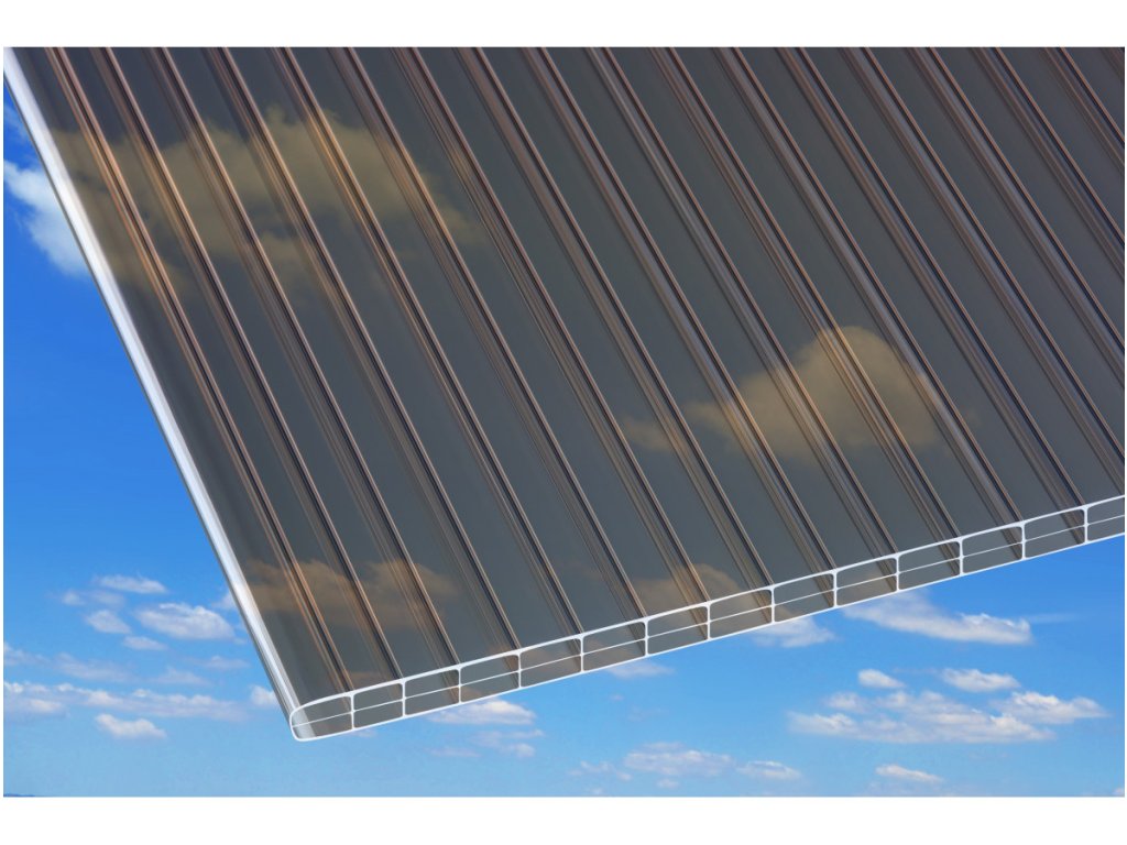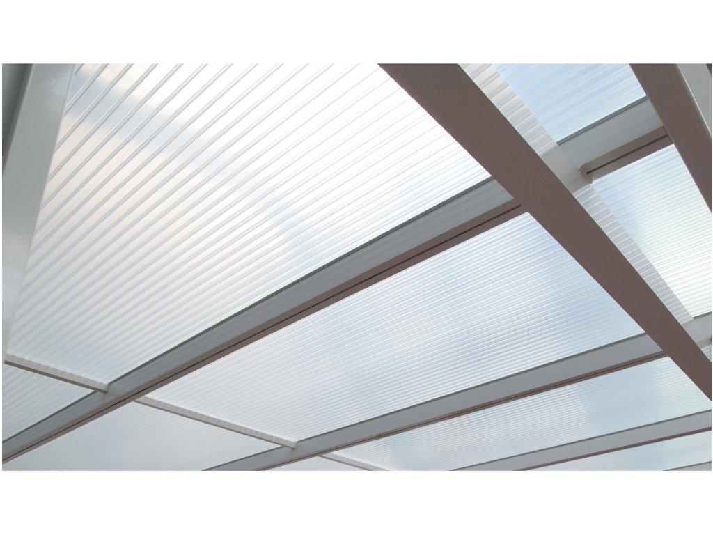 Zastřešení je řešeno kvalitním bronzovým komůrkovým polykarbonátem Guttagliss DUAL 16 mm, který v ČR prošel náročnými testy ve státem akreditovaných zkušebnách jako stavební materiál. Polykarbonát je opatřen jednostrannou UV ochranou. To vše zaručuje vysokou odolnost proti nepříznivému počasí. Odolá zatížení sněhem až do 150 kg / m2.