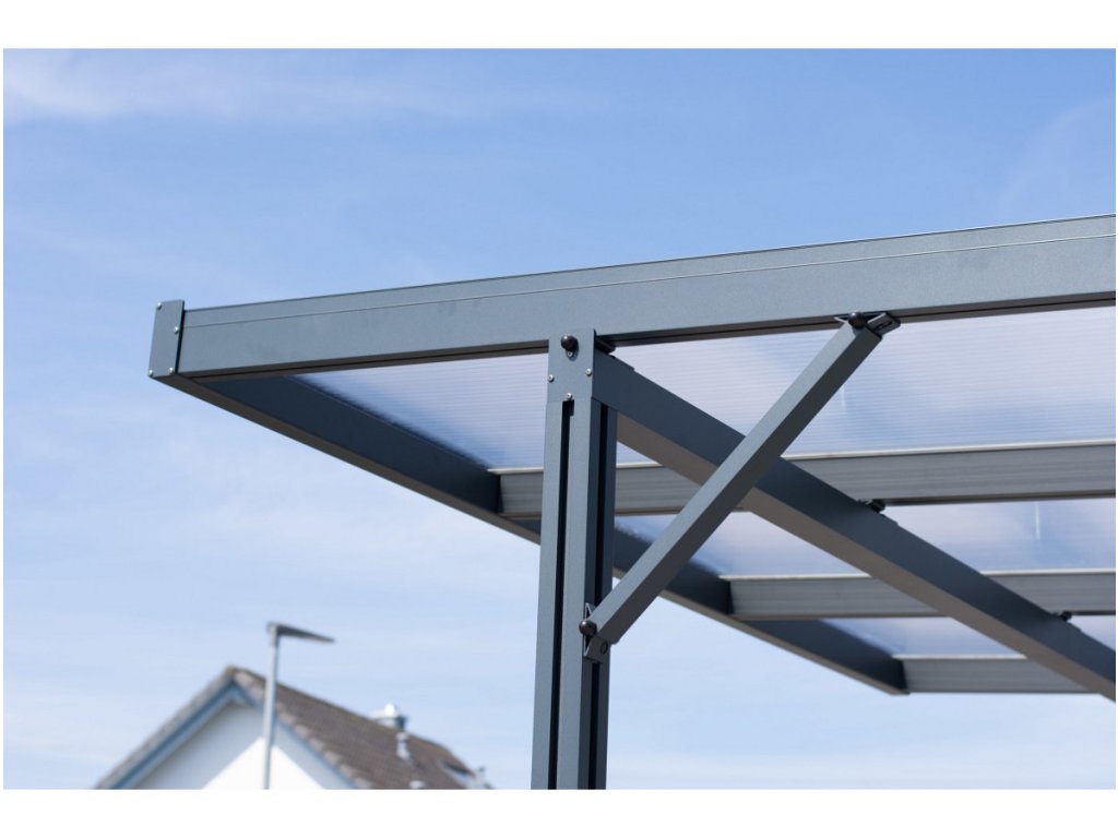 Robustní rámová konstrukce přístřešku je vyrobena z vysoce odolné hliníkové slitiny o síle profilů 2-4 mm. Je opatřena antikorozním nástřikem práškovým lakováním v antracitové barvě. Díky tomu je přístřešek vysoce odolný vůči rezavění, plísním a mechům a je v podstatě bezúdržbový. Podpěry a nožky jsou z 2 mm galvanizované oceli a jsou individuálně nastavitelné. Pro zvýšení ochrany vašeho auta lze ke Carport Premium PC dokoupit příslušenství, jako je boční či zadní stěna. V konstrukci carportu jsou připraveny profilové drážky, do kterých stačí stěny zasunout.