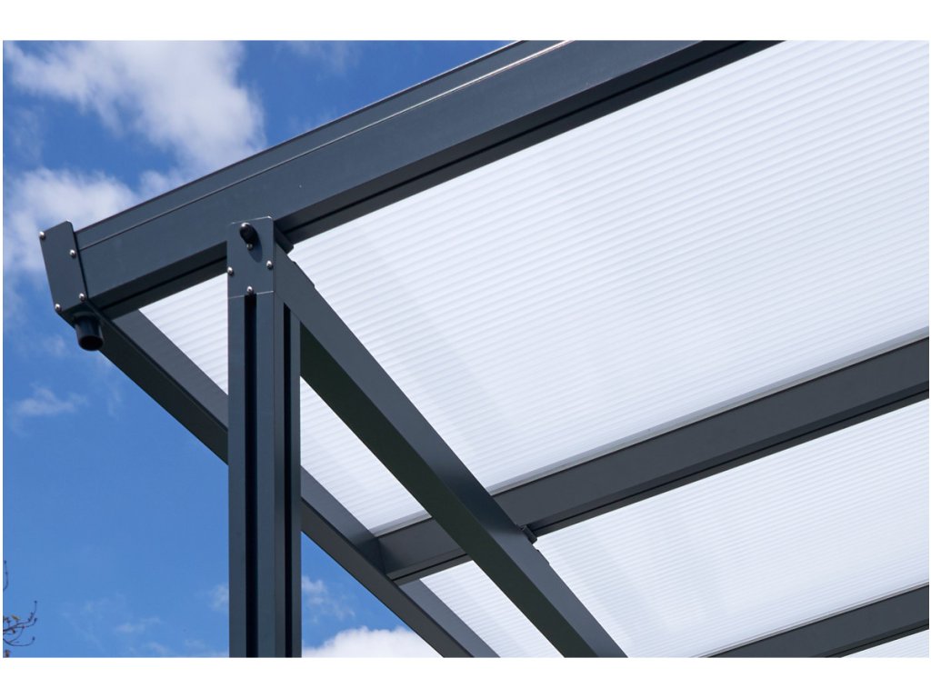 Robustní rámová konstrukce přístřešku je vyrobena z vysoce odolné hliníkové slitiny o síle profilů 2-4 mm. Je opatřena antikorozním nástřikem práškovým lakováním v antracitové barvě. Díky tomu je přístřešek vysoce odolný vůči rezavění, plísním a mechům a je v podstatě bezúdržbový. Podpěry a nožky jsou z 2 mm galvanizované oceli a jsou individuálně nastavitelné. Pro zvýšení ochrany vašeho auta lze ke Carport Premium PC dokoupit příslušenství, jako je boční či zadní stěna. V konstrukci carportu jsou připraveny profilové drážky, do kterých stačí stěny zasunout.