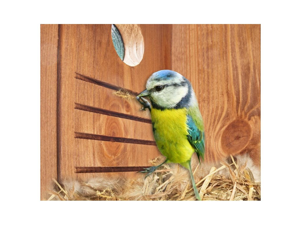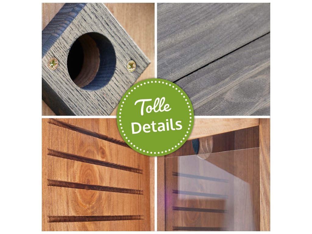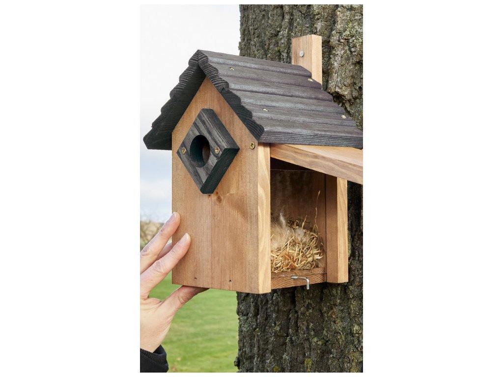 Boční strana domku se dá snadno otevřít pro čištění . Za otvorem je tabule z plexiskla, aby hnízdo při otevření nevypadlo. Můžete také vidět, zda jsou v hnízdě mláďata. Uvnitř hnízdečka jsou praktické drážky, ty usnadňují mladým ptákům vylézt k výstupnímu otvoru. Zvenčí je silná ochrana proti predátorům. Vykrádači hnízd jako kukačka nemají šanci vejce ukrást.