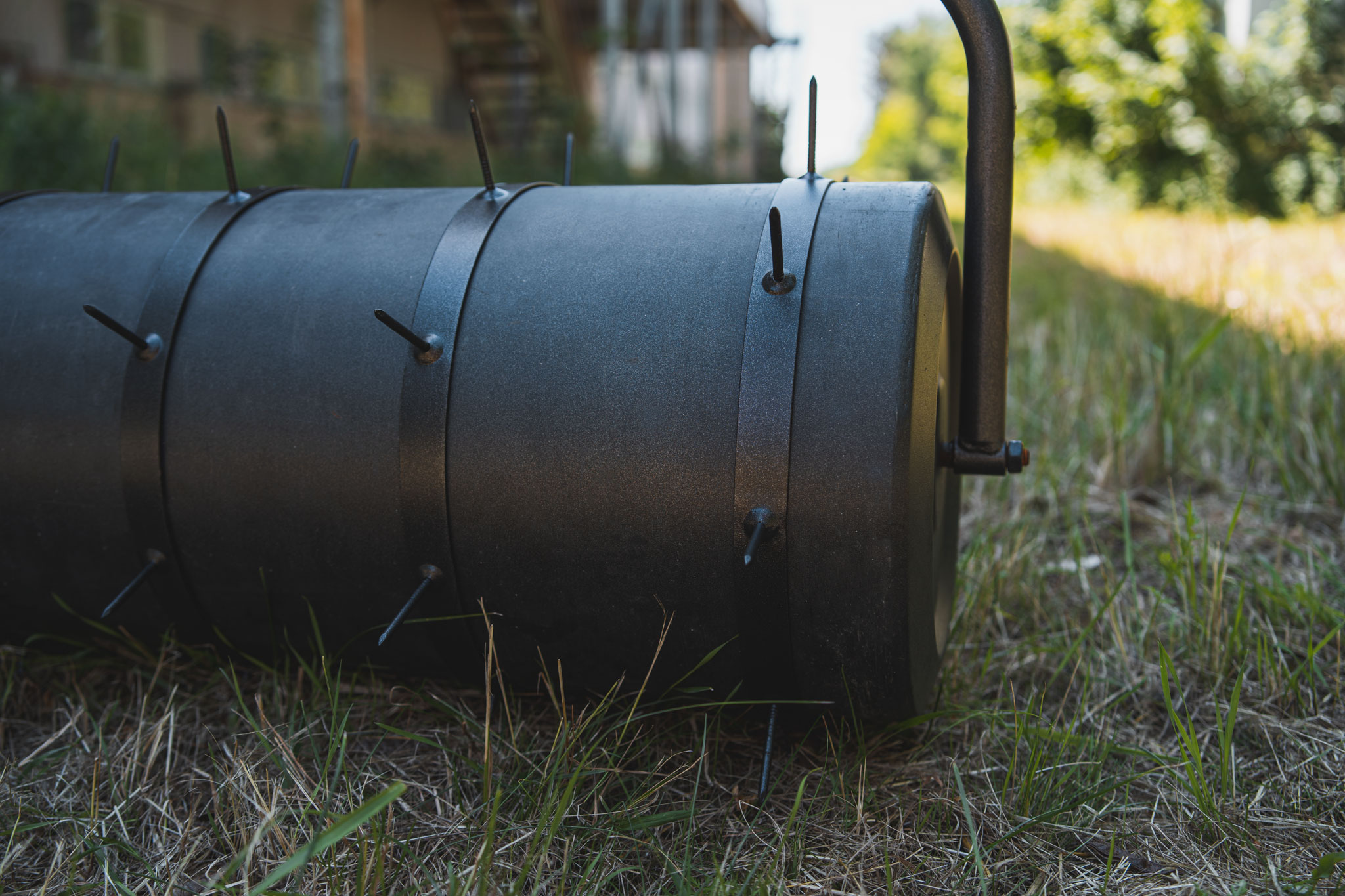 Opět můžete použít zahradní válec, na který připevníte opasky s hroty - ty provzdušní trávník do hloubky 5 cm.
