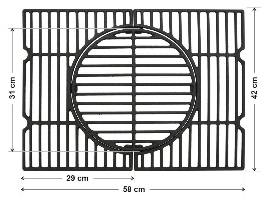 Litinový rošt s třídílnou konstrukcí s celkovými rozměry 58 x 42 cm se středovou částí o průměru 31 cm.