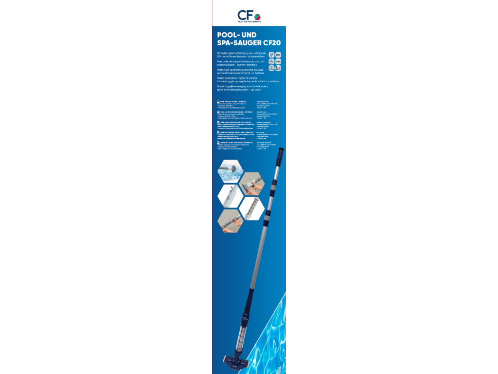 Ruční bazénový vysavač CF 20 AKU je praktickým pomocníkem pro každého, kdo chce udržovat svůj bazén nebo vířivku čisté bez zbytečné námahy a bez kabelů. Díky bezdrátovému provedení a automatickému spuštění při ponoření do vody je jeho použití maximálně pohodlné a intuitivní. Výkonný 18 W motor v kombinaci s účinným filtračním košem spolehlivě odstraní písek, listí, drobné nečistoty i usazeniny ze dna bazénu. Lithium-iontová baterie s kapacitou 4000 mAh zajistí až 60 minut provozu na jedno nabití (= 20-30 čistících cyklů), což bohatě postačí pro běžnou údržbu menších bazénů, vířivek a nadzemních bazénů. Vysavač je vybaven teleskopickou tyčí s nastavitelnou délkou (85–178 cm, celková délka 145-238 cm), díky které se snadno dostanete i do hůře přístupných míst. Součástí balení jsou také tři vyměnitelné nástavce, které umožňují přizpůsobit vysavač různým typům povrchů a nečistot. CF 20 AKU je ideální volbou pro všechny, kdo hledají jednoduché, rychlé a efektivní řešení čištění bazénu bez složité instalace a připojování hadic. TIP: špína se vám po celodenním koupání usadila vjednom místě? Právě pro tyto případy je ruční bateriový vysavač ideálním pomocníkem. Vysavač ponoříte do bazénu, okamžitě se spustí a vysáto máte do minuty. Klíčové vlastnostiBezdrátový ruční bazénový vysavač Automatický start při ponoření do vody (AUTO-START) Výkonný 18 W motor Až 60 minut provozu na jedno nabití (20-30 čistících cyklů = měsíc provozu) Účinný filtrační koš pro zachycení nečistot Teleskopická tyč pro pohodlnou manipulaci (85–178 cm, celková délka 145-238 cm) 3 nástavce pro různé typy čištění Vhodný pro bazény, vířivky i nadzemní bazény5 vychytávek, které oceníteAUTO-START funkce – žádné tlačítko, vysavač se zapne sám při ponoření do vody Plná volnost pohybu – žádné kabely ani hadice Dlouhá výdrž baterie – až hodina nepřetržitého čištění Flexibilní použití – tři nástavce pro dno, rohy i jemné nečistoty Lehká konstrukce – snadná manipulace i jednou rukouTechnické parametryTyp: Ruční akumulátorový bazénový vysavač Sací kapacita: cca 30 l/min Motor: 18 W Účinná šířka sání: cca 20 cm Akumulátor: Lithium-Ion, 4000 mAh, 3,7 V Provozní doba: až 60 minut Doba nabíjení: 4–5 hodin Teleskopická tyč: Nastavitelná délka 85–178 cm (celková délka 145-238 cm) Stupeň krytí: IPX8Obsah balení1× ruční bazénový vysavač CF 20 AKU 1× lithium-iontový akumulátor 1× nabíječka 3× výměnný nástavec 1× teleskopická tyčSrovnání ručních bazénových vysavačůVlastnost / modelNEOVA SMART VACCF AQUA BROOMCF 20 AKUCF 25 AKUTyp napájeníNapojení na filtraciBaterie (D / LR20)Akumulátor (Li-Ion)Akumulátor (Li-Ion)Provozní dobaNeomezenáaž 3 hodinyaž 60 minaž 60 minFiltrace nečistotVnitřní síťka + filtraceFiltrační sáček + retenční ventilFiltrační košFiltrační sáčky (hrubý + jemný)Zabránění návratu nečistot✔ Ano✔ Ano (patent)✔ Ano✔ AnoŠířka sací hlavyStandardníKompaktnícca 20 cmcca 25 cmTeleskopická tyč v balení✔ Ano (1,5 m)✖ Ne✔ Ano (do 178 cm)✔ Ano (do 150 cm)HmotnostVelmi nízkácca 2 kg (nejlehčí)NízkáStředníTyp zákazníkaNízká cena & jednoduchostMaximální výdrž & nezávislostPohodlí & jednoduchostVýkon & výsledekDoplňkové parametry