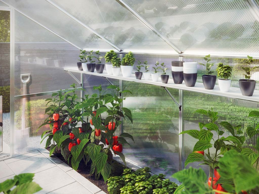 Praktická závěsná police KGT je vyrobena z vysoce kvalitního hliníku a udržuje skleník v pořádku. Je umístěna podél celé boční stěny skleníku. Vysoce odolné plastové police lze jednotlivě vyjmout a snadno vyčistit. Díky inteligentnímu upevnění ke skleníku vydrží všechny nosné prvky vysoké zatížení. Hloubka závěsné police je přibližně 26 cm.