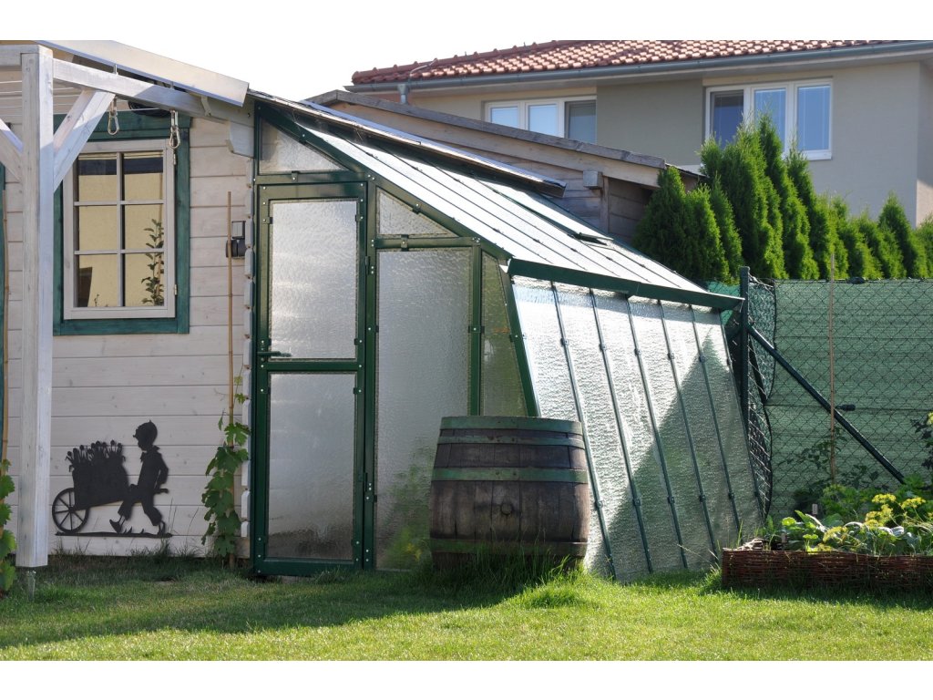 Konstrukce skleníkové přístavby je z žárově zinkovaného plechu o síle 1 a 1,5 mm. Boční stěny skleníku jsou šikmé, zajišťují optimální dopad slunečních paprsků. Stejně jako ostatní plochy jsou i stěny vyplněny rozptylovým sklem o síle 4 mm. Pokud byste měli zájem o čiré sklo, případně pokud byste chtěli zvýšit pevnost vybraných skel můžete nám napsat a přiobjednat si jejich varianty v kalené verzi, kde výrobce deklaruje 5x vetší pevnost. Pokud by vás tento skleník zaujal a spíše byste uvítali polykarbonátové výplně, podívejte se na variantu s polykarbonátem zde.