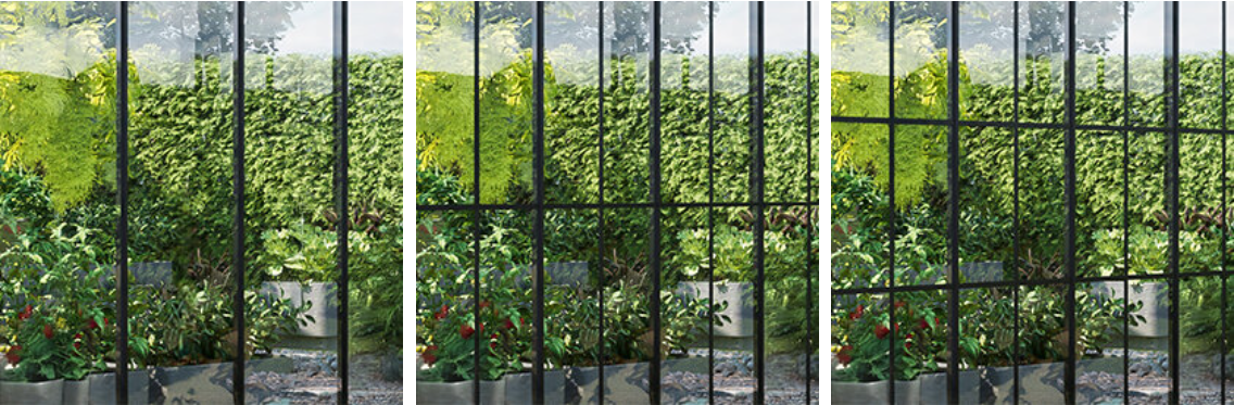 Pro zvýraznění architektonického charakteru skleníku lze zvolit dekorativní hliníkové lišty určené pro skleněné výplně. Tyto dekorace jsou navrženy tak, aby dodaly skleníku elegantní a osobitý vzhled, aniž by narušily jeho funkčnost. K dispozici jsou varianty bez dekorace, s jedním křížem nebo s dvojitým křížem, přičemž každý typ vytváří odlišný vizuální dojem – od minimalistického po tradičnější vzhled. Dekorativní lišty jsou barevně sladěny s konstrukcí skleníku a vyrobeny z hliníku, což zajišťuje jejich dlouhou životnost a minimální nároky na údržbu.