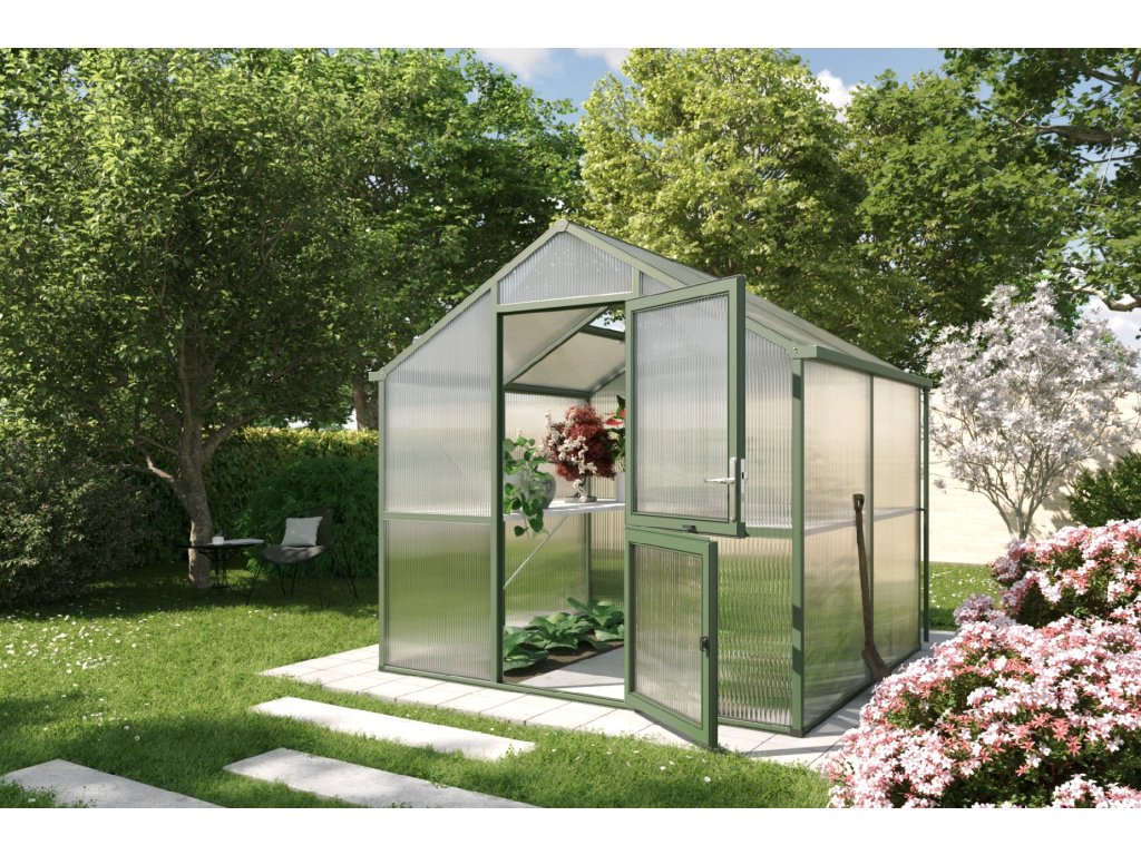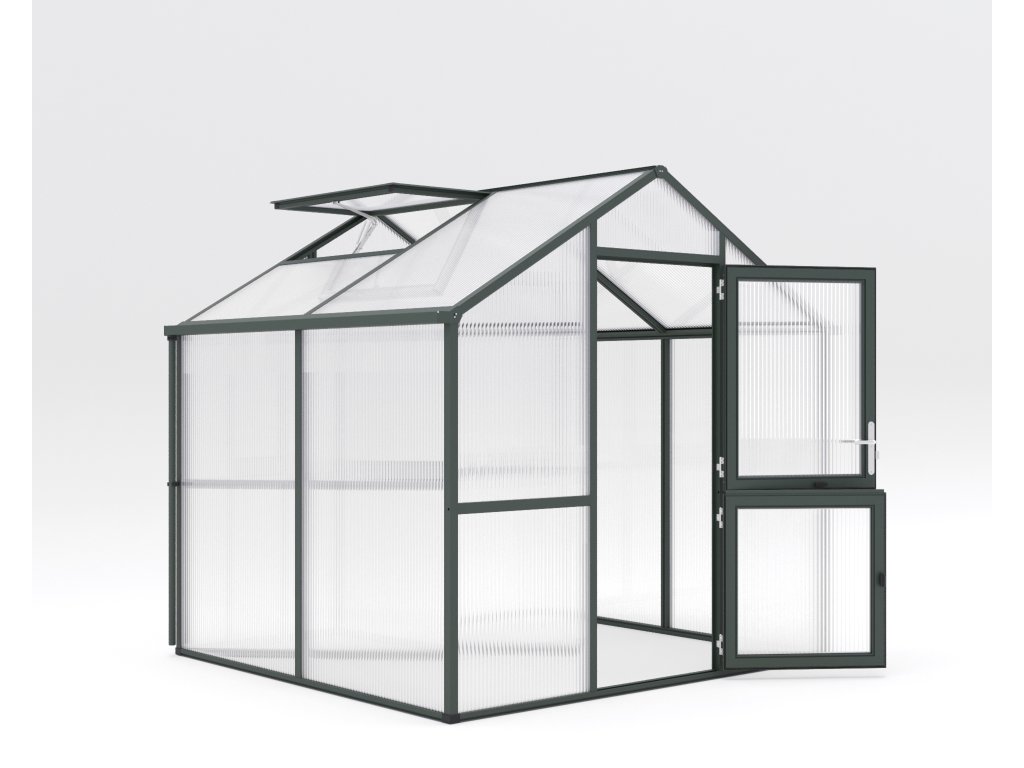 Skleník Iris je dostupný ve třech barevných variantách: přírodní hliník, jedlově zelená (RAL 6009) a antracitově šedá (DB 703). Díky tomu si můžete vybrat design, který nejlépe zapadne do vaší zahrady.