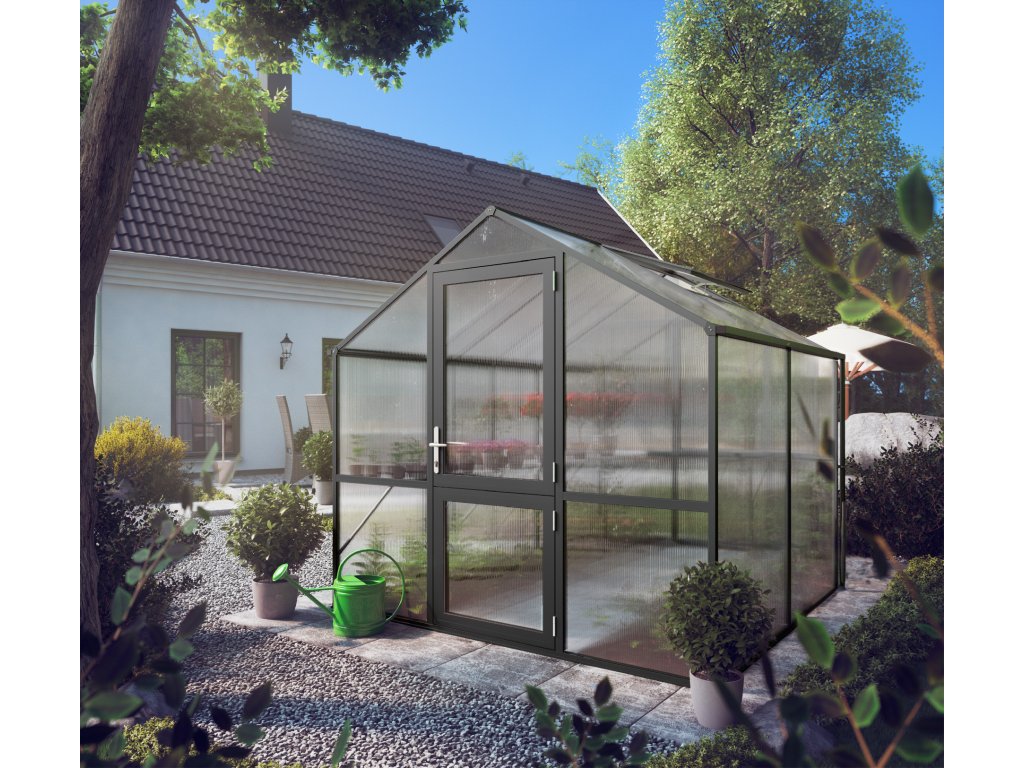 Hliníkový skleník KGT Rose II antracit byl speciálně vyvinut pro náročné hobby zahradníky. Průhledné dvojité stěny ISO o tloušťce 10 mm jsou po celém obvodu zcela uzavřeny v profilech, takže se desky ani při nepřízni počasí nemohou uvolnit. K upevnění nejsou použity žádné sponky ani drobné příchytky – zasklení výrazně zvyšuje stabilitu celé konstrukce. Dvojité stěny nepropouštějí UV záření, a proto stínění obvykle není nutné; zároveň mají vysokou izolační hodnotu, takže se teplo udrží ve skleníku déle.