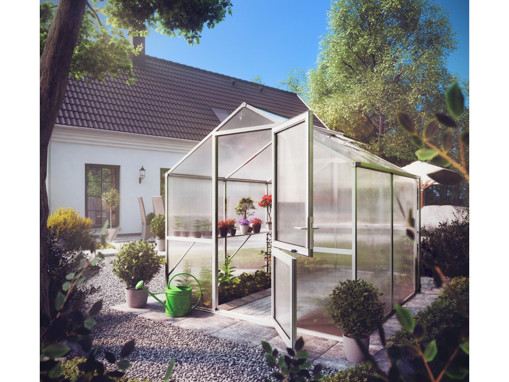 Hliníkový skleník KGT Rose II šedá byl speciálně vyvinut pro náročné hobby zahradníky. Průhledné dvojité stěny ISO o tloušťce 10 mm jsou po celém obvodu zcela uzavřeny v profilech, takže se desky ani při nepřízni počasí nemohou uvolnit. K upevnění nejsou použity žádné sponky ani drobné příchytky – zasklení výrazně zvyšuje stabilitu celé konstrukce. Dvojité stěny nepropouštějí UV záření, a proto stínění obvykle není nutné; zároveň mají vysokou izolační hodnotu, takže se teplo udrží ve skleníku déle.