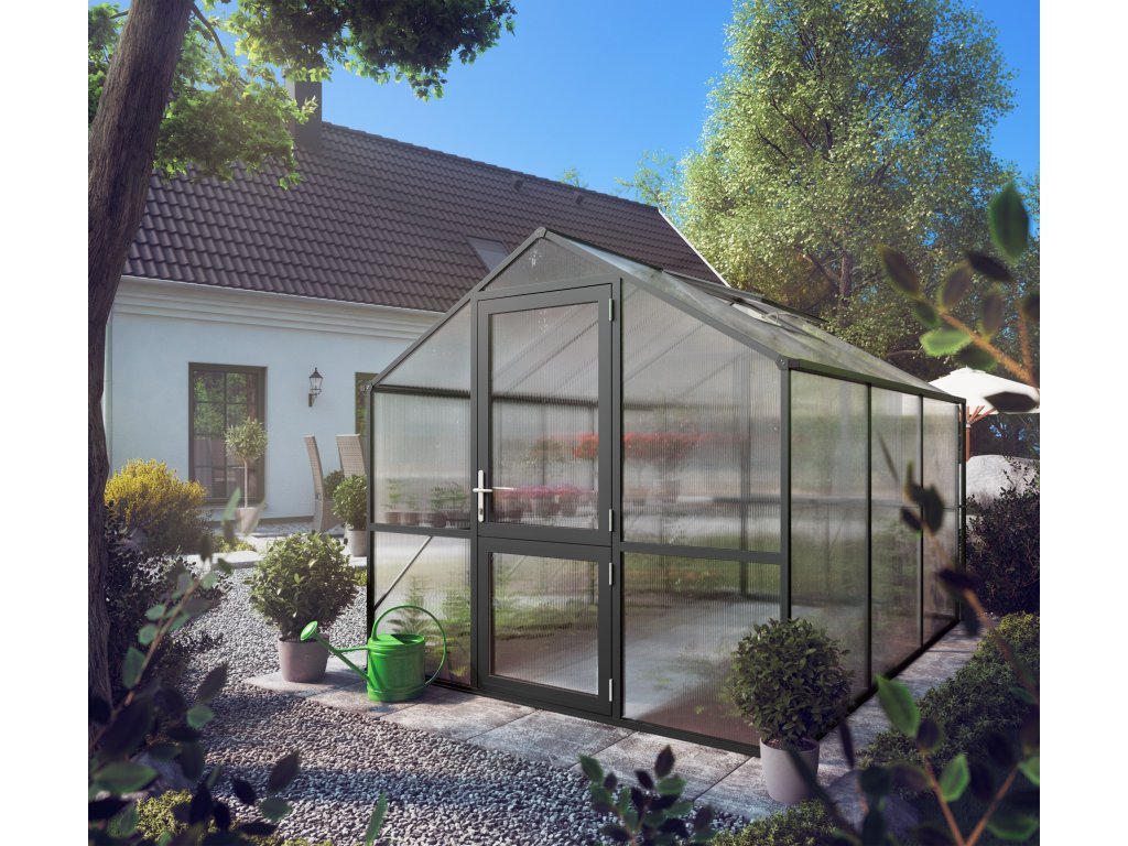Hliníkový skleník KGT Rose III antracit byl speciálně vyvinut pro náročné hobby zahradníky. Průhledné dvojité stěny ISO o tloušťce 10 mm jsou po celém obvodu zcela uzavřeny v profilech, takže se desky ani při nepřízni počasí nemohou uvolnit. K upevnění nejsou použity žádné sponky ani drobné příchytky – zasklení výrazně zvyšuje stabilitu celé konstrukce. Dvojité stěny nepropouštějí UV záření, a proto stínění obvykle není nutné; zároveň mají vysokou izolační hodnotu, takže se teplo udrží ve skleníku déle.