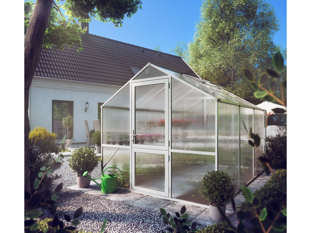 Hliníkový skleník KGT Rose III šedá barva byl speciálně vyvinut pro náročné hobby zahradníky. Průhledné dvojité stěny ISO o tloušťce 10 mm jsou po celém obvodu zcela uzavřeny v profilech, takže se desky ani při nepřízni počasí nemohou uvolnit. K upevnění nejsou použity žádné sponky ani drobné příchytky – zasklení výrazně zvyšuje stabilitu celé konstrukce. Dvojité stěny nepropouštějí UV záření, a proto stínění obvykle není nutné; zároveň mají vysokou izolační hodnotu, takže se teplo udrží ve skleníku déle.