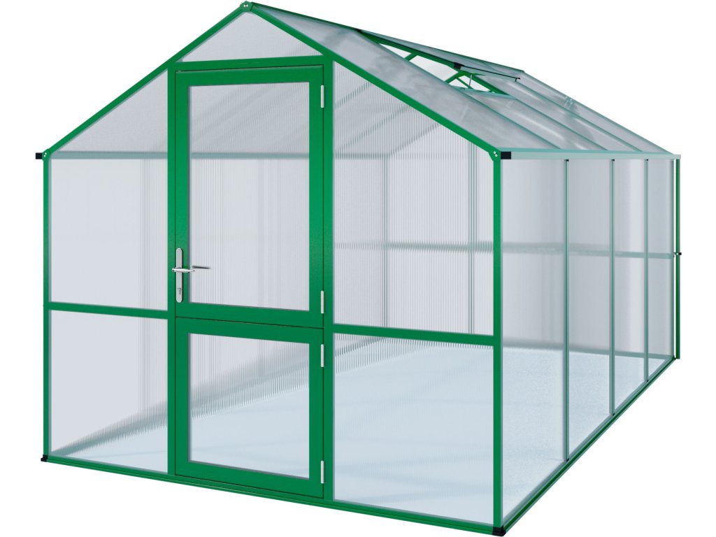 Hliníkový skleník KGT Rose zelená byl speciálně vyvinut pro náročné hobby zahradníky. Průhledné dvojité stěny ISO o tloušťce 10 mm jsou po celém obvodu zcela uzavřeny v profilech, takže se desky ani při nepřízni počasí nemohou uvolnit. K upevnění nejsou použity žádné sponky ani drobné příchytky – zasklení výrazně zvyšuje stabilitu celé konstrukce. Dvojité stěny nepropouštějí UV záření, a proto stínění obvykle není nutné; zároveň mají vysokou izolační hodnotu, takže se teplo udrží ve skleníku déle.