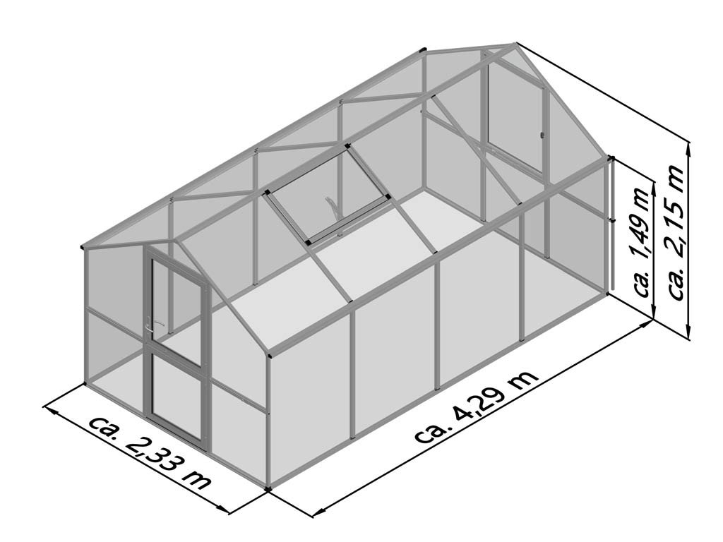 Se stojící výškou stěny 1,49 m a velkorysou výškou hřebene 2,15 m je ve skleníku dost prostoru pro vás i vaše rostliny. Rajčata a okurky mohou bez problémů růst vzhůru a plně se rozvíjet. Skleník Rose je vybaven dělenými otočnými dveřmi a oknem v zadní stěně s ručním otevíráním; o komfortní přívod čerstvého vzduchu se stará střešní okno s automatickým otvíráním. O bezpečí se postará uzamykatelná sada pákových klik Hoppe a hladce fungující vnitřní dveřní panty. Standardem jsou také okapy s odtokovými trubkami na obou stranách (délka 1,40 m).