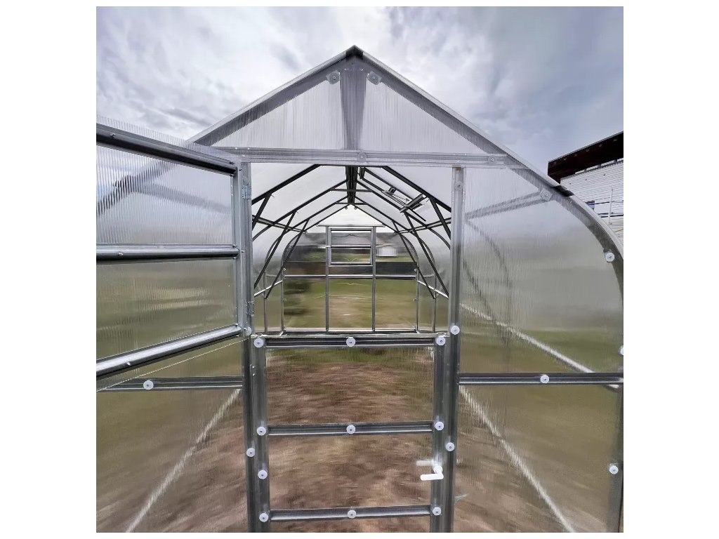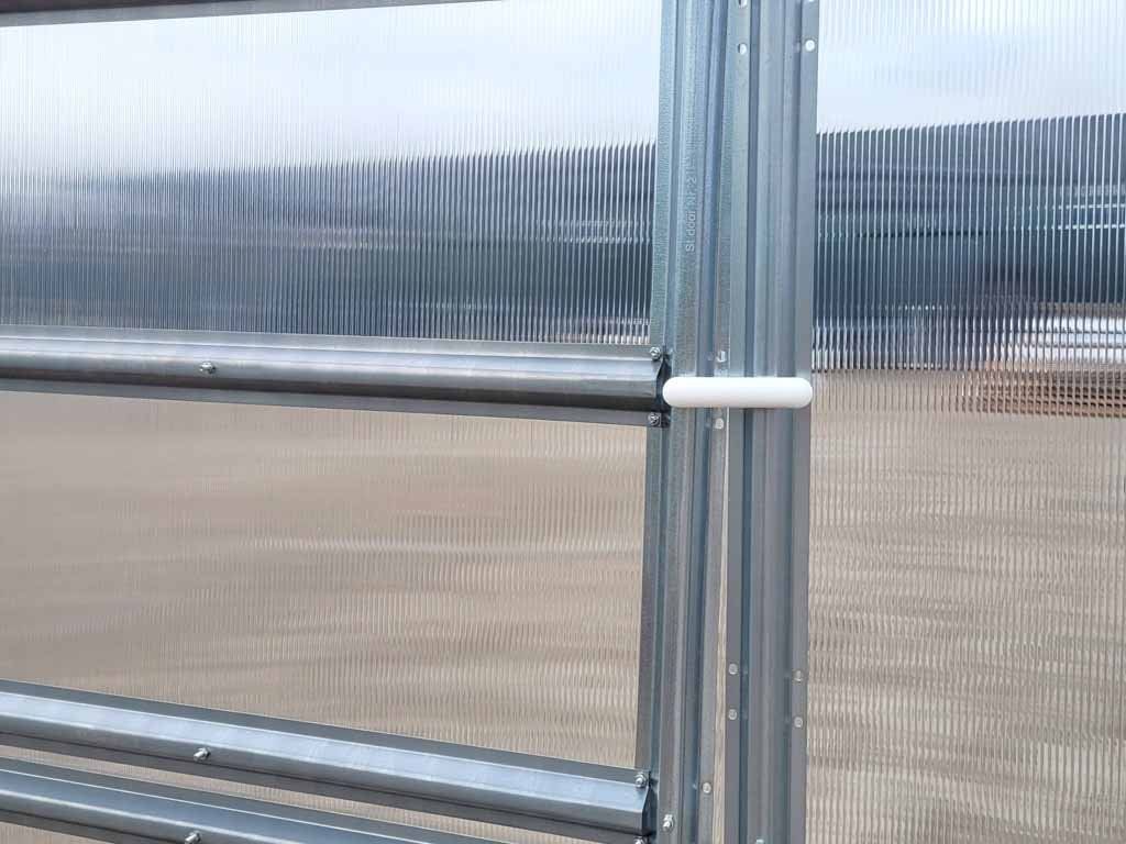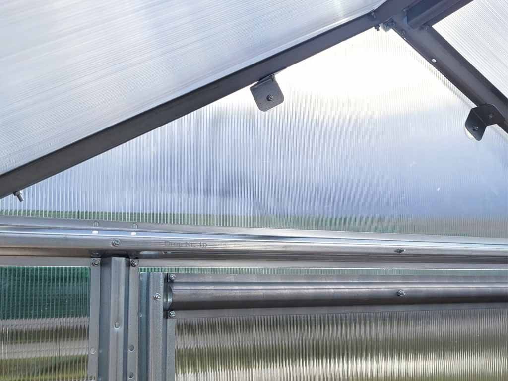 Prosklení tvoří komůrkový polykarbonát tloušťky 4 mm – lehký, ale velmi odolný materiál s vyšší nárazovou odolností než sklo. Dutinková struktura dobře udržuje teplo, takže ve skleníku zůstává příznivé klima i při chladnějším počasí nebo v noci. Polykarbonát je transparentní, propouští dostatek světla a zároveň pomáhá chránit rostliny před UV zářením.