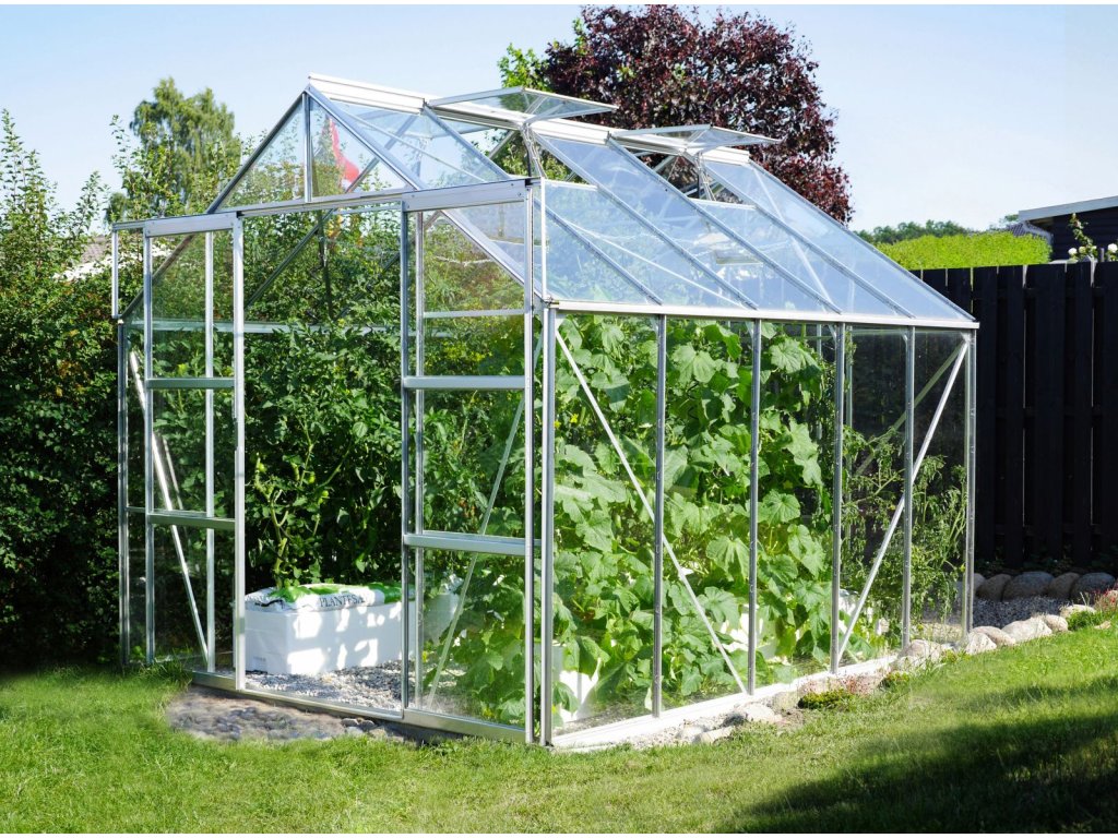 Konstrukce skleníku je vyrobena z kvalitních eloxovaných hliníkových profilů 1,2 mm, kdy výrobce poskytuje smluvní záruku 15 let na AL konstrukci. Prosklení je z kaleného čirého skla síly 3 mm. Čiré sklo zajišťuje výbornou světelnou propustnost, takže do skleníku je krásně vidět ze všech stran a můžete se kochat barvami pěstovaných rostlin. Kalená verze skla navíc zajišťuje jeho naprostou bezpečnost - v případě rozbití se skleněná výplň roztříští na tisíce malých kousků, což zabrání případnému vážnému zranění. To je velmi důležitá vlastnost skleníku, kterou ocení především rodiče malých dětí pobíhajících po zahradě. Prosklení je do hliníkových profilů kotveno pomocí ocelových sponek. Pokud by vás tento skleník zaujal, ale spíše byste uvítali polykarbonátové výplně, podívejte se na varianty s polykarbonátem zde.
