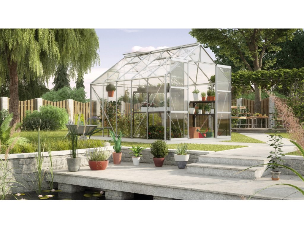 Skleník ze skla VITAVIA URANUS 8300, čiré sklo 3 mm, stříbrný + základna VITAVIA URANUS 8300 šedá