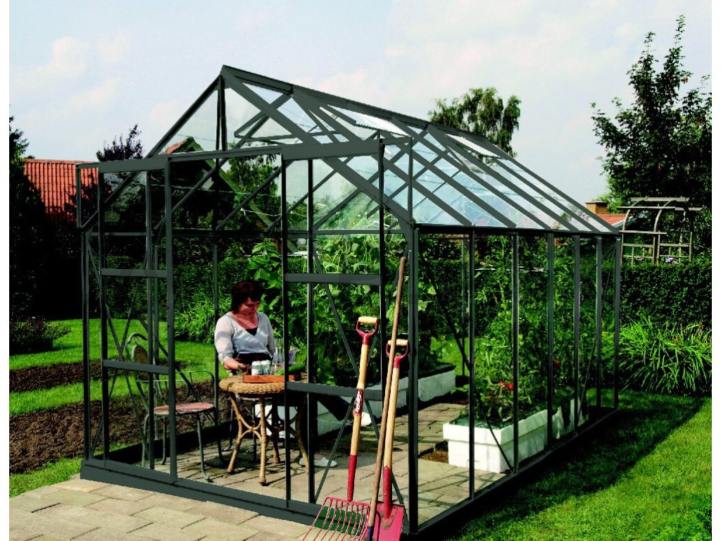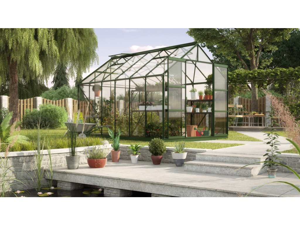 Skleník ze skla VITAVIA URANUS 9900, čiré sklo 3 mm, zelený + základna VITAVIA URANUS 9900 zelená