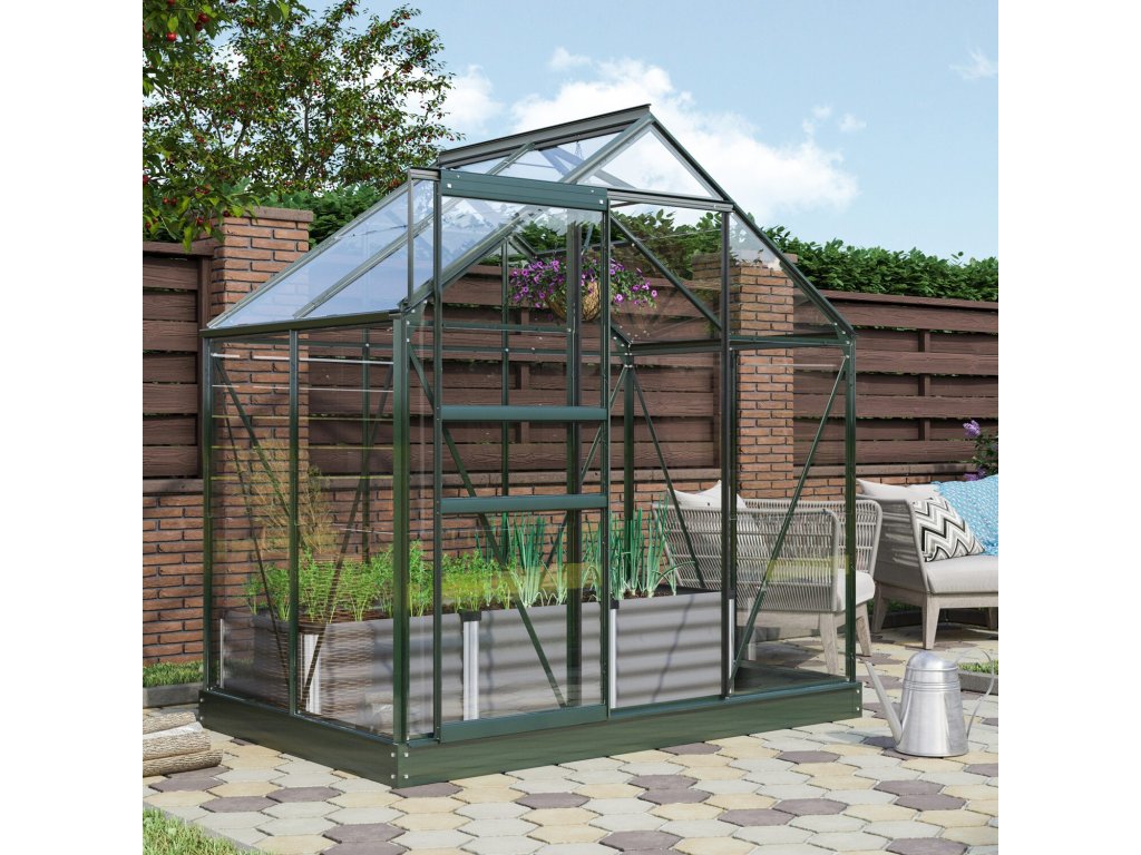 Konstrukce skleníku je vyrobena z kvalitních eloxovaných hliníkových profilů 1,2 mm, kdy výrobce poskytuje smluvní záruku 15 let na AL konstrukci. Prosklení je z kaleného čirého skla síly 3 mm. Čiré sklo zajišťuje výbornou světelnou propustnost, takže do skleníku je krásně vidět ze všech stran a můžete se kochat barvami pěstovaných rostlin. Kalená verze skla navíc zajišťuje jeho naprostou bezpečnost - v případě rozbití se skleněná výplň roztříští na tisíce malých kousků, což zabrání případnému vážnému zranění. To je velmi důležitá vlastnost skleníku, kterou ocení především rodiče malých dětí pobíhajících po zahradě. Prosklení je do hliníkových profilů kotveno pomocí ocelových sponek. Pokud by vás tento skleník zaujal, ale spíše byste uvítali polykarbonátové výplně, podívejte se na varianty s polykarbonátem zde.