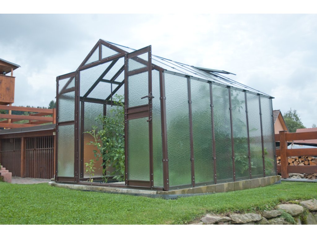 Konstrukce skleníku je z žárově zinkovaného plechu o síle 1 a 1,5 mm – navíc opatřena jeklovými výztuhami o síle 3 mm zaručující větší odolnost. Boční stěny skleníku jsou téměř svislé, což umožňuje umístění různých regálků k vnitřním stěnám. Stejně jako ostatní plochy jsou i stěny vyplněny rozptylovým sklem o síle 4 mm. Pokud byste měli zájem o čiré sklo, případně pokud byste chtěli zvýšit pevnost vybraných skel můžete nám napsat a přiobjednat si jejich varianty v kalené verzi, kde výrobce deklaruje 5x vetší pevnost.