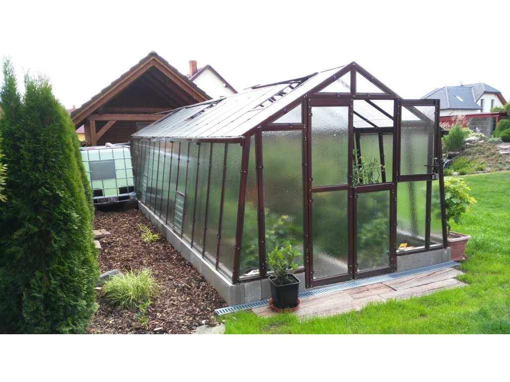 Konstrukce skleníku je z žárově zinkovaného plechu o síle 1 a 1,5 mm – navíc opatřena jeklovými výztuhami o síle 3 mm zaručující větší odolnost. Boční stěny skleníku jsou mírně šikmé, což zaručuje perfektní přístup světla a zároveň umožňuje umístění různých regálů k vnitřním stěnám. Stejně jako ostatní plochy jsou i stěny vyplněny rozptylovým sklem o síle 4 mm. Pokud byste měli zájem o čiré sklo, případně pokud byste chtěli zvýšit pevnost vybraných skel můžete nám napsat a přiobjednat si jejich varianty v kalené verzi, kde výrobce deklaruje 5x vetší pevnost.