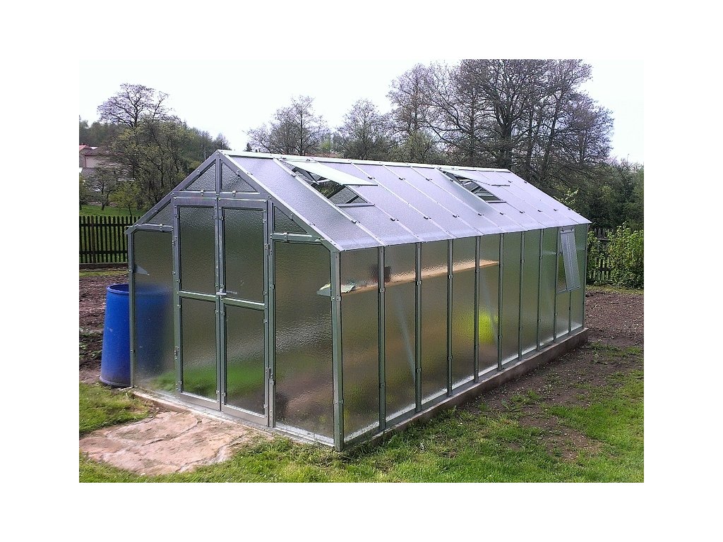 Konstrukce skleníku je z žárově zinkovaného plechu o síle 1 a 1,5 mm. Boční stěny skleníku jsou téměř svislé, což umožňuje umístění různých regálů k vnitřním stěnám. Stejně jako ostatní plochy jsou i stěny vyplněny rozptylovým sklem o síle 4 mm. Pokud byste měli zájem o čiré sklo, případně pokud byste chtěli zvýšit pevnost vybraných skel můžete nám napsat a přiobjednat si jejich varianty v kalené verzi, kde výrobce deklaruje 5x vetší pevnost.