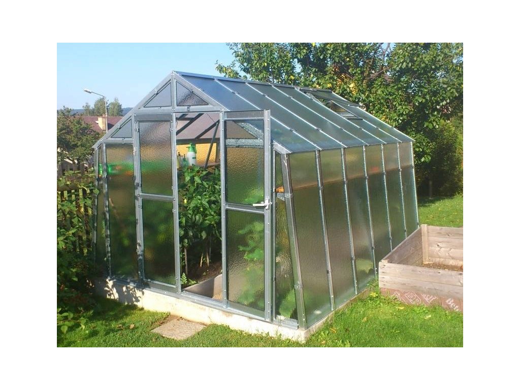 Konstrukce skleníku je z žárově zinkovaného plechu o síle 1 a 1,5 mm. Boční stěny skleníku jsou mírně šikmé a zajišťují optimální dopad slunečních paprsků, ale zároveň umožňují umístění různých regálů k vnitřním stěnám. Stejně jako ostatní plochy jsou i stěny vyplněny rozptylovým sklem o síle 4 mm. Pokud byste měli zájem o čiré sklo, případně pokud byste chtěli zvýšit pevnost vybraných skel můžete nám napsat a přiobjednat si jejich varianty v kalené verzi, kde výrobce deklaruje 5x vetší pevnost.