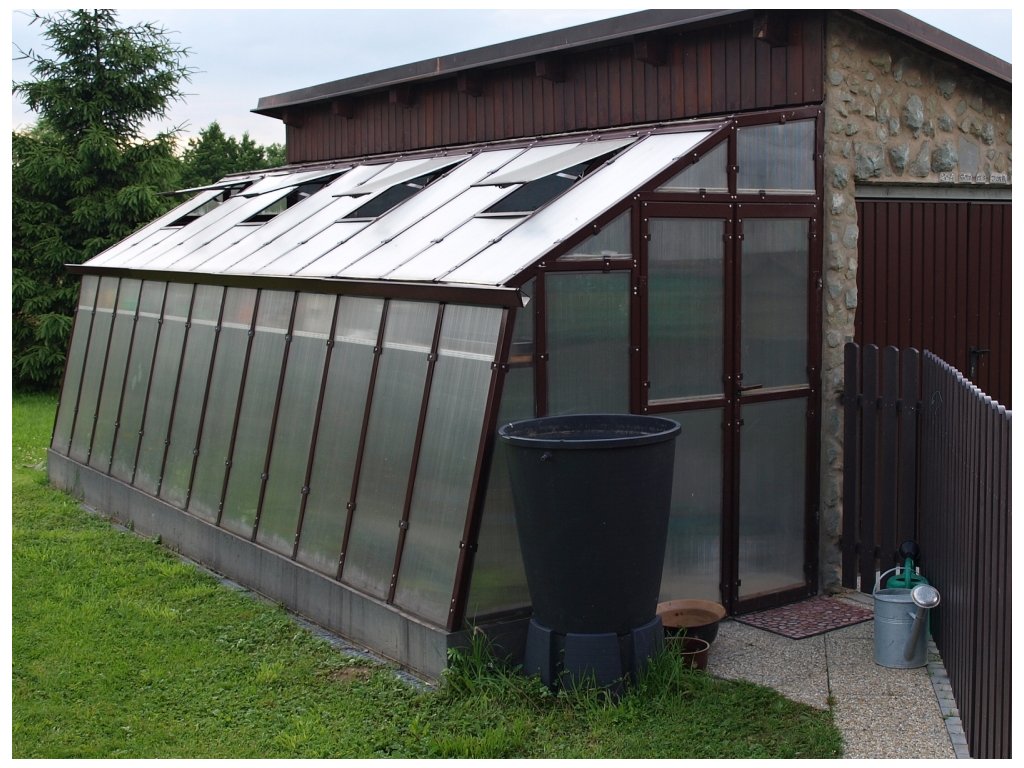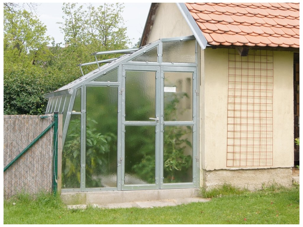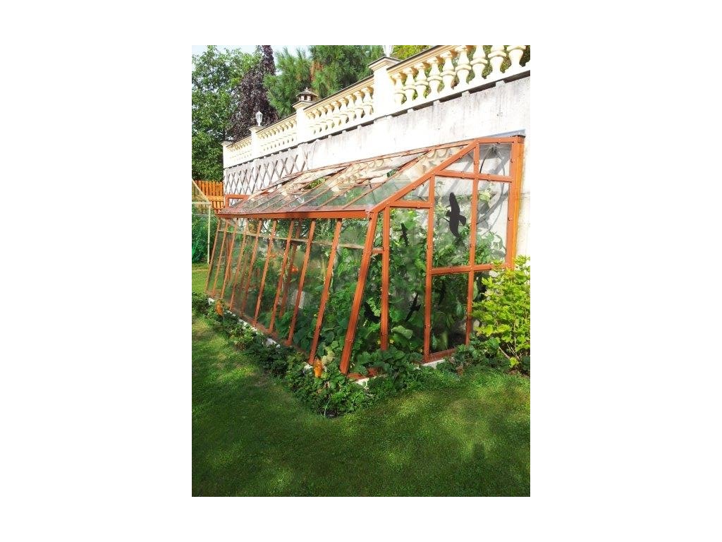 Konstrukce skleníkové přístavby je z žárově zinkovaného plechu o síle 1 a 1,5 mm. Boční stěny skleníku jsou šikmé, zajišťují optimální dopad slunečních paprsků. Stejně jako ostatní plochy jsou i stěny vyplněny rozptylovým sklem o síle 4 mm. Pokud byste měli zájem o čiré sklo, případně pokud byste chtěli zvýšit pevnost vybraných skel můžete nám napsat a přiobjednat si jejich varianty v kalené verzi, kde výrobce deklaruje 5x vetší pevnost. Pokud by vás tento skleník zaujal a spíše byste uvítali polykarbonátové výplně, podívejte se na variantu s polykarbonátem zde.