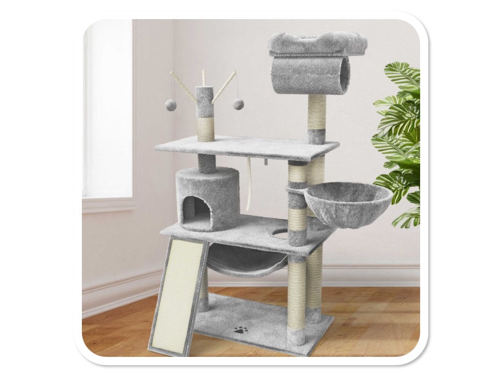 Škrábe vám Váš chlupatý mazlíček sedačku a šplhá po záclonách? S naším vymazleným škrabadlem už nebude! Dopřejte své kočičce luxusní útočiště. Toto víceúrovňové škrabadlo je dokonalou kombinací komfortu, bezpečí a zábavy, díky čemuž splní všechny potřeby vaší kočičky. Nabízí dva útulné domečky, tři vyvýšené plošiny, bambulky na hraní, dvě houpací síťea sisalové škrábací sloupky. Moderní design v šedém provedení skvěle doplní váš interiér.