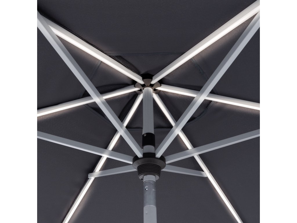 Naklápěcí slunečník s LED osvětlením Doppler ACTIVE s velkou střechou s UV filtrem v elegantní antracitové barvě vám poskytne dokonalou ochranu před slunečními paprsky na balkónu nebo zahradě a prodlouží vaše letní večery díky integrovanému LED osvětlení v ramenech slunečníku. Nabíjení baterie probíhá automaticky pomocí solárního panelu. Dostanete náhradní baterii a USB nabíječku jako bonus. Stabilní tyč slunečníku, vyrobená z masivního, pevného a lehkého hliníku, je vybavená klikou pro rychlé otevírání a zavírání.
