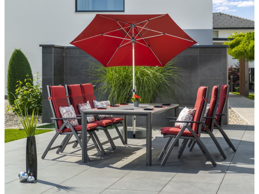 Naklápěcí klika, kterou snadno otevřete slunečník a zároveň slouží k naklápění slunečníku bez nutnosti vstávání od stolu.