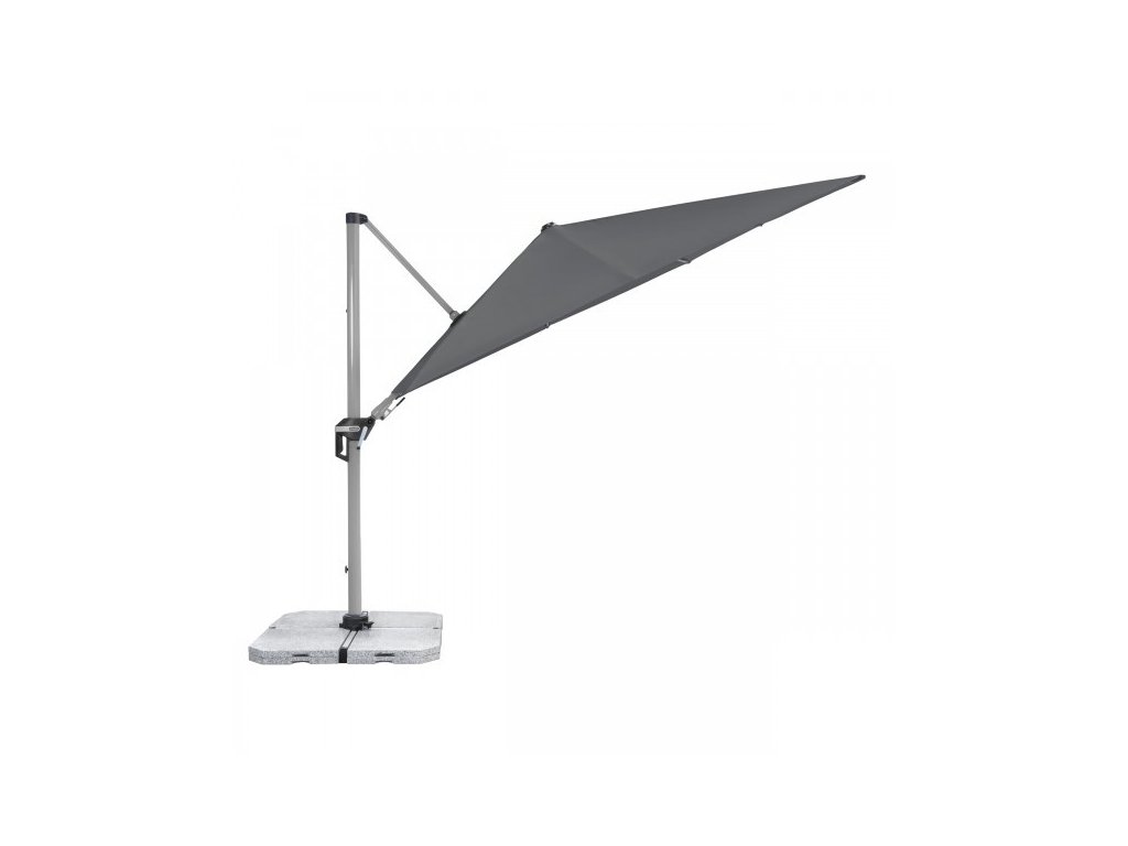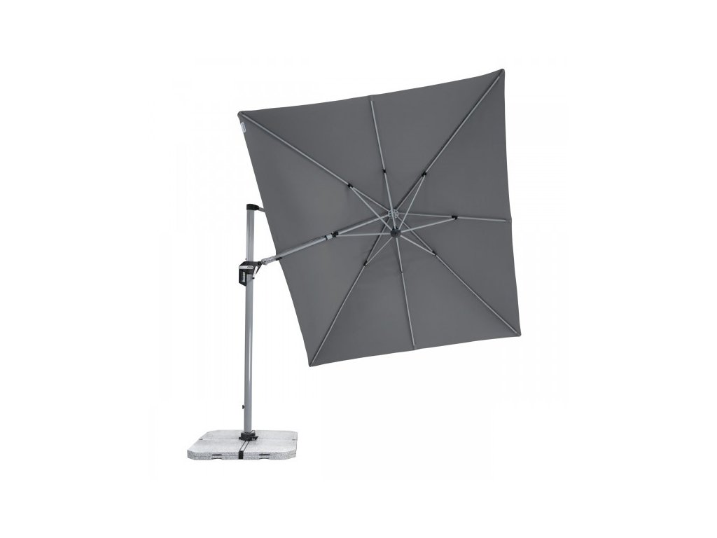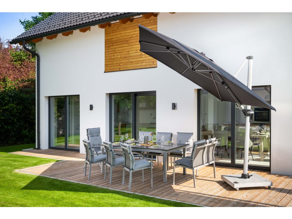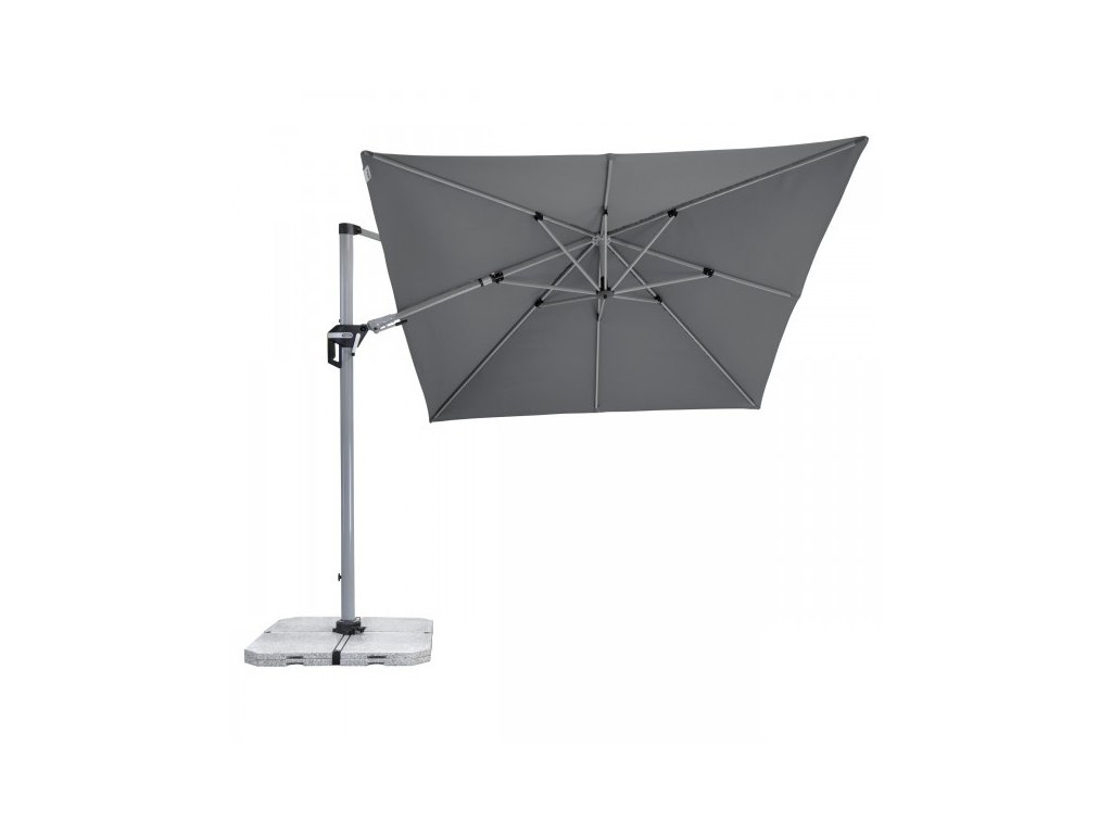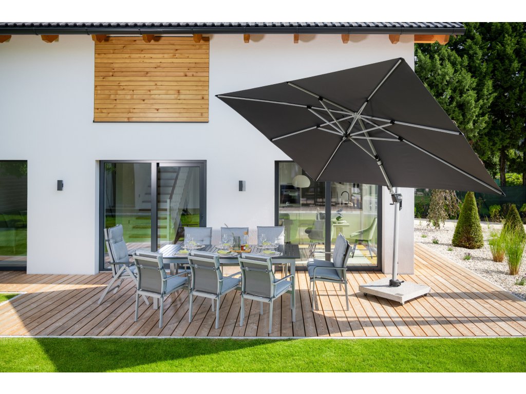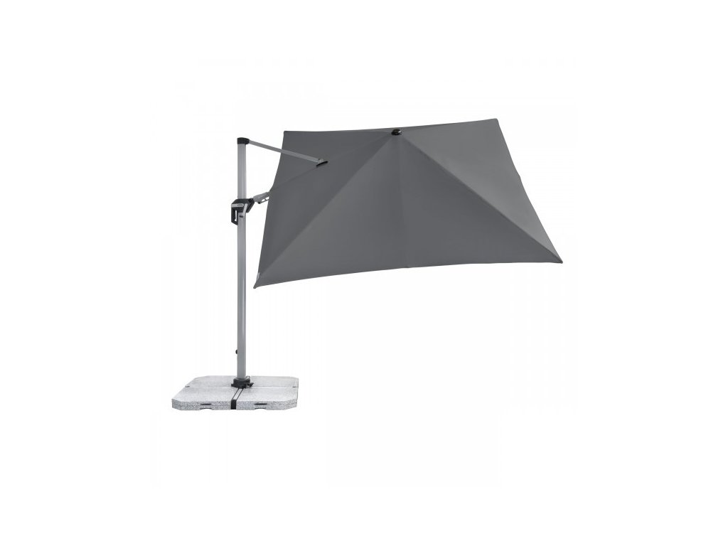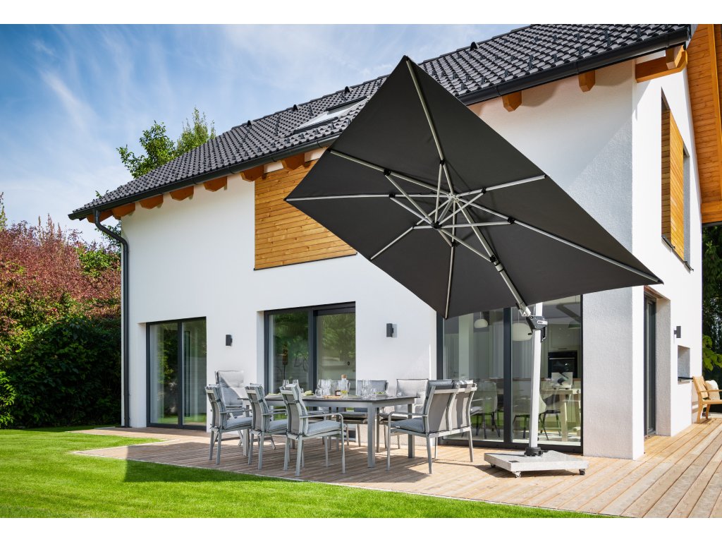 Výkyvný slunečník Doppler Active 350 x 260 cm je velice všestranný a vysoce kvalitní díky pevnému hliníkovému rámu. Obdélníkový tvar střechy je obzvláště vhodný pro zastínění zahradního nábytku. Kromě toho se slunečník dá přizpůsobit pohybu slunce během dne, protože se otáčí o 360°, natáčí se axiálně na obě strany a může být nastaven pod úhlem dozadu, a tak se optimálně přizpůsobuje pohybu slunce. Potah je vyroben z polyesterové tkaniny odpuzující vodu s dobrou UV ochranou 50+. Instalace na žulový sokl nebo zemní kotvu.