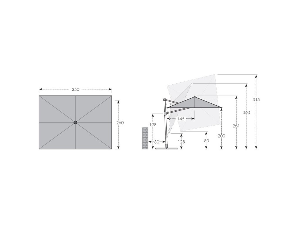 Výkyvný slunečník Doppler Active 350 x 260 cm je velice všestranný a vysoce kvalitní díky pevnému hliníkovému rámu. Obdélníkový tvar střechy je obzvláště vhodný pro zastínění zahradního nábytku. Kromě toho se slunečník dá přizpůsobit pohybu slunce během dne, protože se otáčí o 360°, natáčí se axiálně na obě strany a může být nastaven pod úhlem dozadu, a tak se optimálně přizpůsobuje pohybu slunce. Potah je vyroben z polyesterové tkaniny odpuzující vodu s dobrou UV ochranou 50+. Instalace na žulový sokl nebo zemní kotvu.