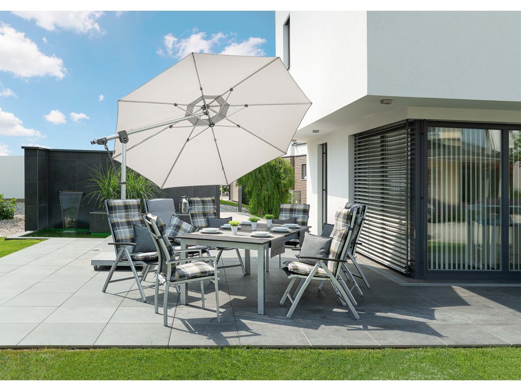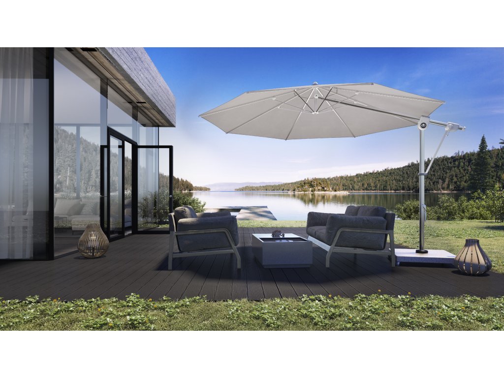 Kvalitní multifunkční výkyvný slunečník s boční tyčí Doppler Expert 350P lze optimálně přizpůsobit poloze slunce díky své schopnosti otáčení o 360° a oboustrannému bočnímu naklápění střechy. Konstrukce je vyrobena z vysoce jakostního hliníku a všechny díly jsou šroubované. Potah je vyroben z polyesterové tkaniny odpuzující vodu s dobrou UV ochranou 80+. Potah je snímatelný, s možností ručního praní. Vodoodpudivý potah je s impregnací proti špíně a plísni včetně ochranného obalu, který chrání slunečník před nepřízní počasí. Instalace na žulový sokl nebo zemní kotvu.