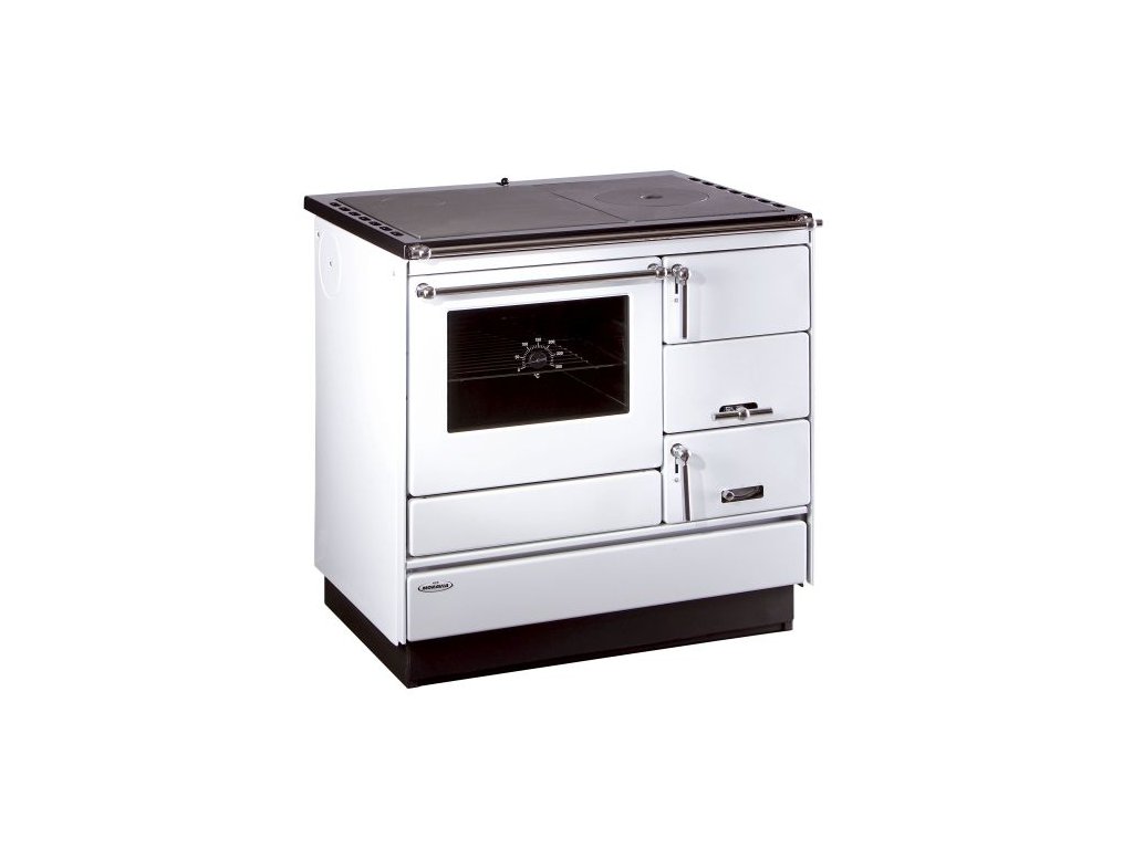 Vlevo je umístěna prostorná, prosklená pečící trouba s teploměrem, která vyniká pečící schopností, což je dáno konstrukcí sporáku, kdy plamen obtéká okolo celého obvodu trouby. Pokud preferujete pečení a vaření před vytápěním, bude tento typ spotřebiče pro vás nejvhodnější. V horní části je litinová varná plotýnka. V předu upoutá výrazné, chromované madlo k sušení. Nechybí ani praktický prostor pro uskladnění dřeva.