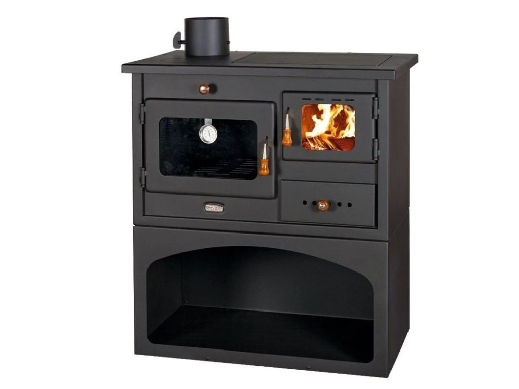 Kuchyňský sporák Prity 1P34 má vlevo umístěnou prosklenou pečící troubou s teploměrem. V horní části jsou dvě varné ocelové plotýnky. Ve spodní části kamen najdete velký prostor pro skladování dřeva.