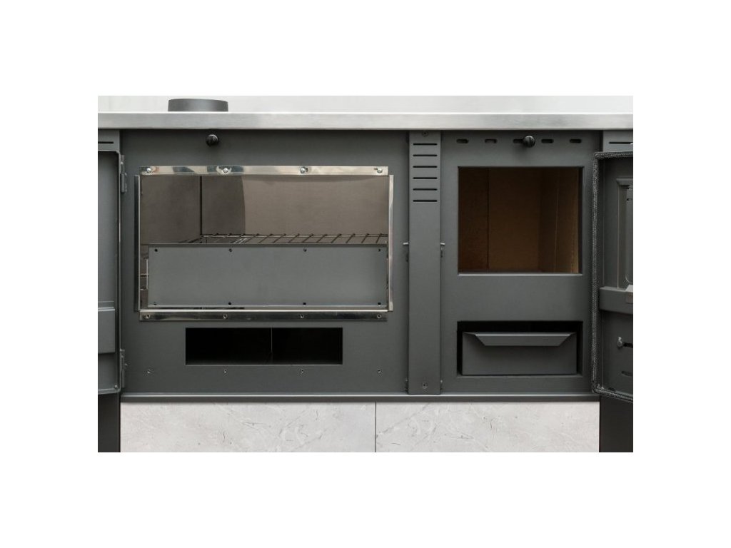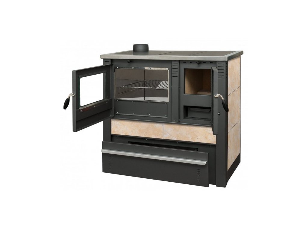 Vaření a ohřev zároveň - tento problém je vyřešen elegantním, praktickým a racionálním způsobem; s prostornou nerezovou troubou a varnou plochou je možné tepelně zpracovávat potraviny zcela nezávisle na elektřině nebo plynu. To šetří dřevo i životní prostředí a snižuje zbytky po spalování. Oddělený přívod primárního a sekundárního vzduchu zajišťuje optimální energetický výnos. Ocelové plechy válcované za studena v kombinaci s pálenými cihlami jsou materiály, ze kterých se kamna vyrábějí. To vše přispívá k jejich spolehlivosti a účinnosti. Strany trouby PANONIA jsou potaženy keramikou té nejvyšší kvality, která udržuje teplo. V případě jakéhokoli mechanického poškození lze keramiku snadno vyměnit podle pokynů k produktu. Speciální ohnivzdorné sklo na topeništi a dvířkách trouby může dosahovat teploty až 850 ° C. Vlevo nahoře je pečicí prostor a přípojka kouřovodu 120 mm. Kouřovody lze čistit bez demontáže kouřovodu. Součástí výbavy je i praktická nádoba na popel pro snadné vyprazdňování a pečící rošt. PANONIA jsou kamna, která se snadno používají a udržují. Během procesu ohřevu zůstávají rukojeti chladné. Jako palivo použijte dřevěné kulatiny, dřevěné brikety, dřevěné uhlí a uhelné brikety. PANONIA splňuje standard CE, což znamená, že je v souladu s nejpřísnějšími předpisy EU o bezpečnosti a energetické účinnosti.