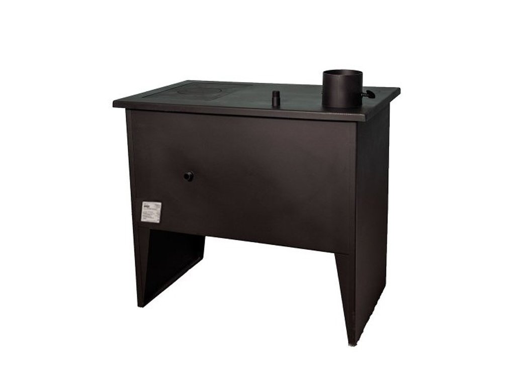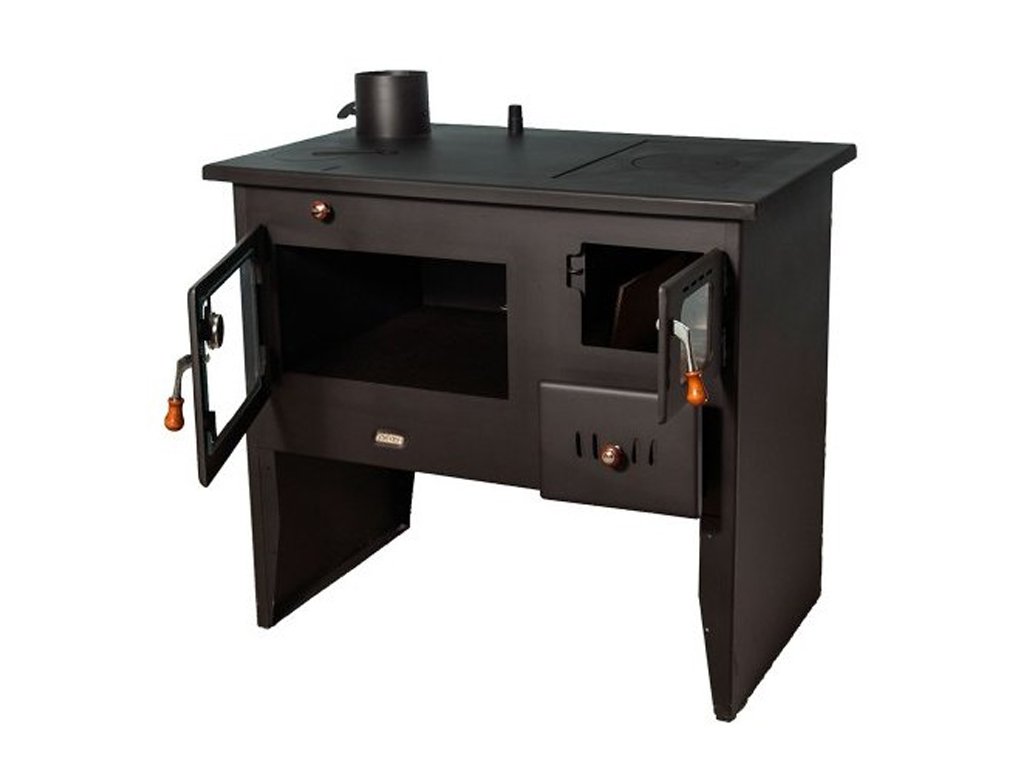 Kuchyňský sporák Prity W12 1P41 má vlevo umístěnou prosklenou pečící troubu s teploměrem. V horní části jsou dvě varné litinové plotýnky. Ve spodní části kamen najdete praktický prostor pro skladování dřeva.