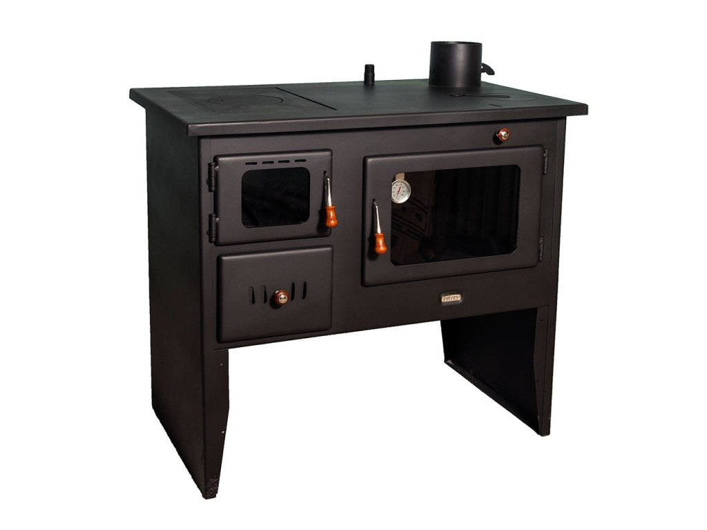 Kuchyňský sporák Prity W12 1P41 má vpravo umístěnou prosklenou pečící troubu s teploměrem. V horní části jsou dvě varné litinové plotýnky. Ve spodní části kamen najdete praktický prostor pro skladování dřeva.