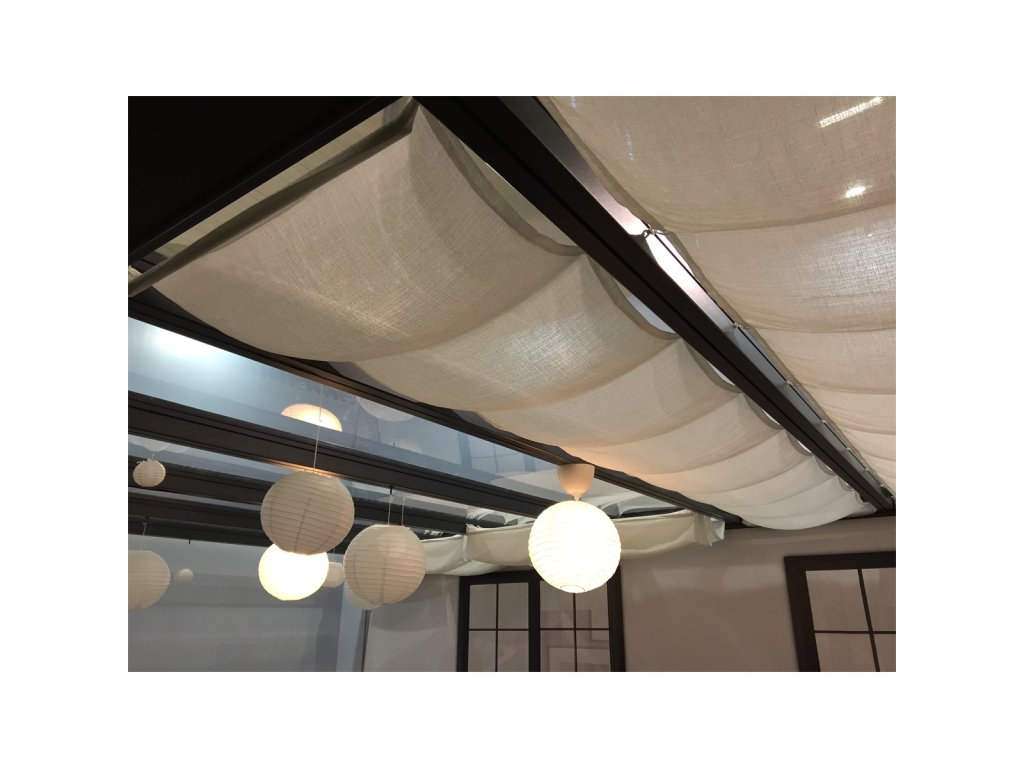 Praktická krémově bílá vícedílná zatahovací zástěna, která se snadno instaluje do drážek profilů pod střechu. V případě slunečného počasí účinně chrání před přílišným přehříváním interiér.