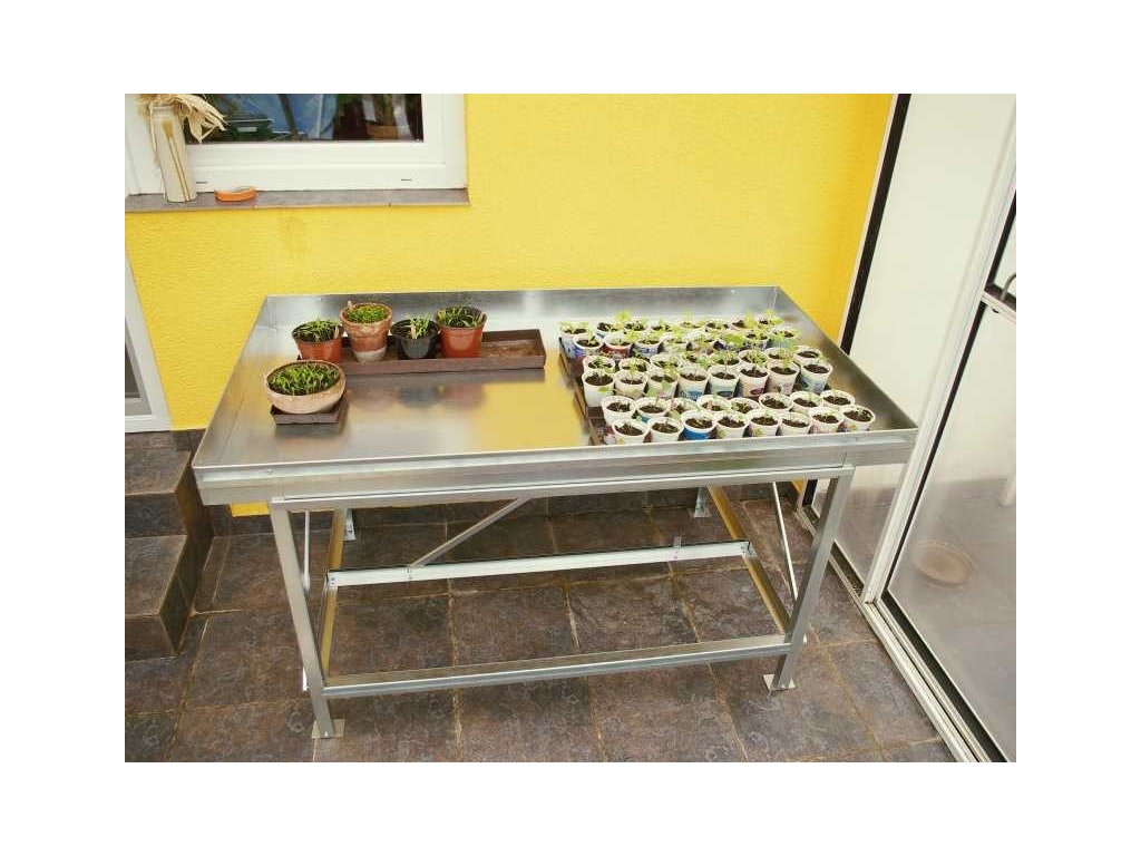 Stůl je vyroben z žárově pozinkovaného plechu o síle 1 a 1,5 mm, který dobře odolává vlhkosti, takže mu voda nevadí, ani jej nemusíte schovávat před deštěm. Díky jeho kompaktním rozměrům ho lze umístit i do skleníků a fóliovníků nejen naší produkce.