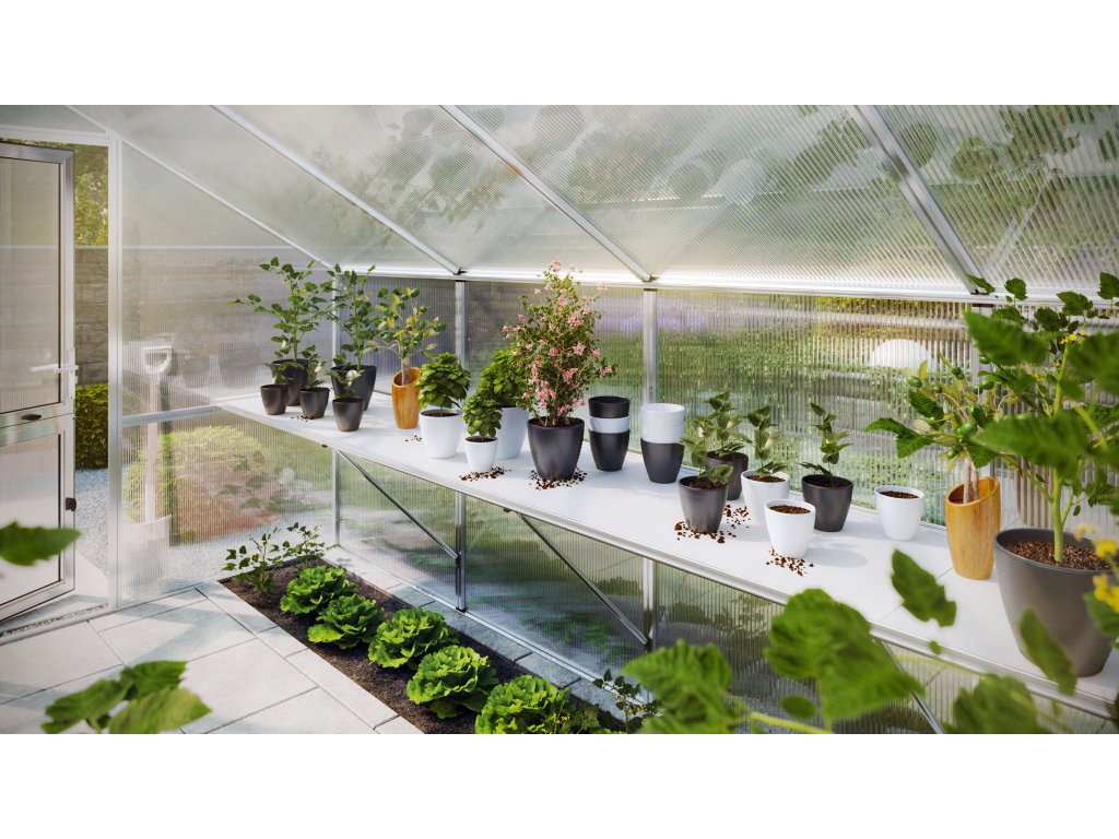 Praktický rám stolu KGT je vyroben z vysoce kvalitního hliníku a udržuje skleník v pořádku. Je vhodný například pro přesazování, setí a péči o rostliny. Běží podél celé boční stěny skleníku. Vysoce odolné bílé plastové police lze jednotlivě vyjmout a snadno vyčistit. Díky inteligentnímu upevnění ke skleníku jsou všechny nosné komponenty vysoce odolné. Hloubka rámu stolu je přibližně 63,5 cm.Doplňkové parametry