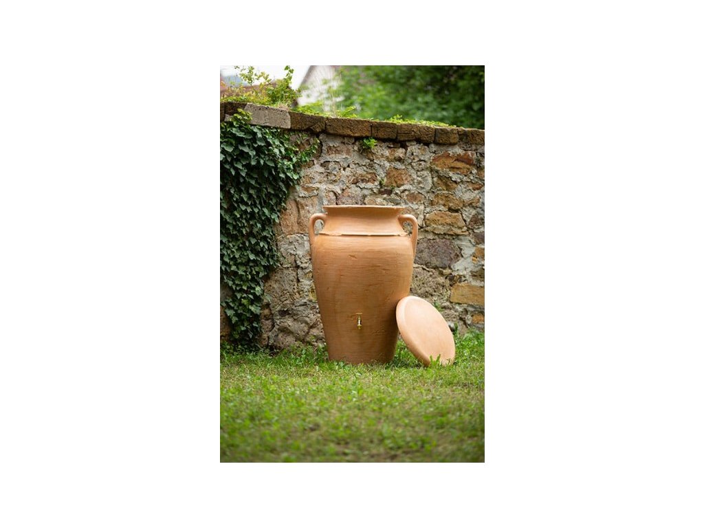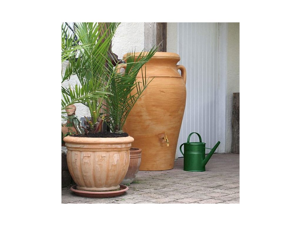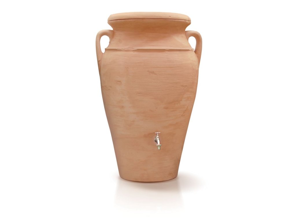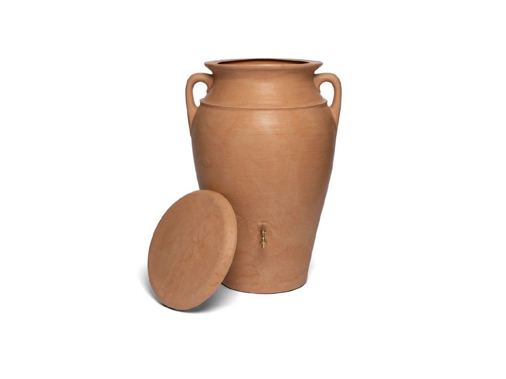 Dekorativní sud na dešťovou vodu HELENA terakota o objemu 300 litrů vypadá jako věrná replika amfory, a proto se hodí zejména do zahrad ve středomořském stylu, skalnatých zahrad, vypadá skvěle vedle cihlové fasády a ve společnosti keramických květináčů. Díky dešťové vodě je zalévání zahrady mnohem ekonomičtější a pro rostliny, jak okrasné a užitkové i prospěšnější. Díky obsahu dusíku ve vodě se tento prvek dostává k rostlinám pro ně přirozenou formou. Dešťová voda neobsahuje chlór, žádné soli vápníku a hořčíku, což jsou chemické látky, které způsobují trvalou nebo dočasnou tvrdost vody. I proto je vhodná pro kapkové závlahy, které se nezanášejí a lépe fungují.