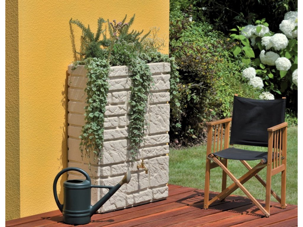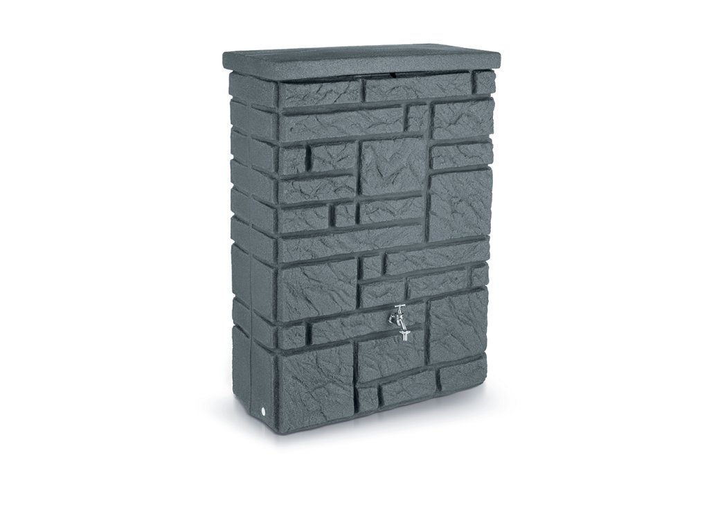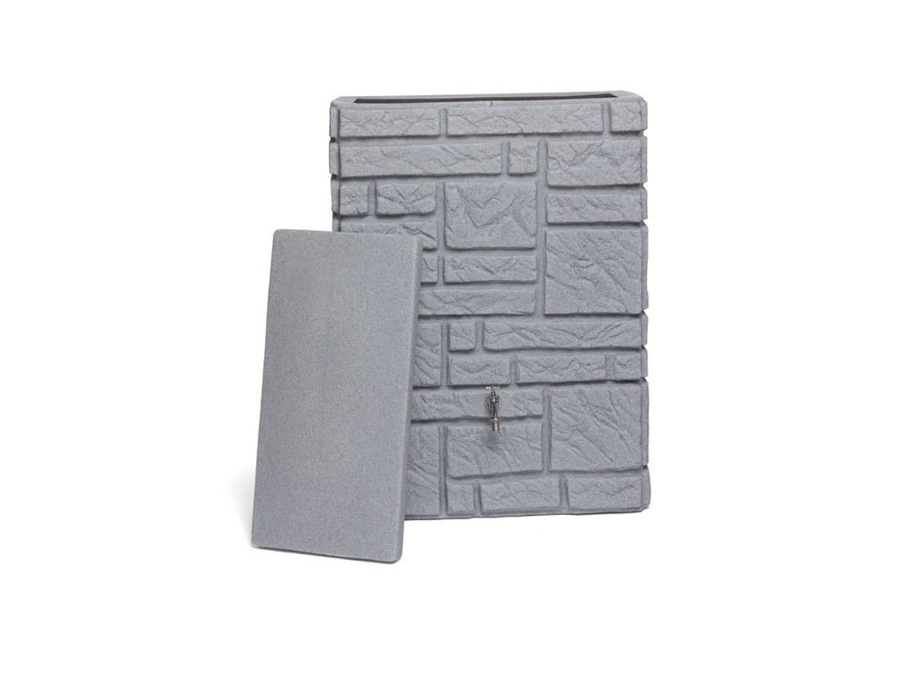 Moderní nádrž na dešťovou vodu Maurano je dekorativní nádrž, která vypadá jako zeď z přírodního kamene. Volitelně lze na tuto nádrž vysadit květiny, podle ročního období. Záhon je umístěn pod snímatelným krytem a vegetační miska je odnímatelná, což velmi usnadňuje její výsadbu. Nádrž je vyrobena z kvalitního plastu, který je odolný vůči povětrnostním vlivům. Největší předností této nádrže na vodu je její elegantní provedení, použité kvalitní materiály a především její praktičnost. Nádrž je na odnímatelném víku vybavena dětskou pojistkou a ve své spodní části je osazena otvorem s 3/4" mosazným závitem pro napojení kohoutku ITAP(není součástí balení). Okap s nádrží lze jednoduše propojit pomocí spojovacího systému Waterform Icanset, který zakoupíte v našem e-shopu. Nádrž má také dva boční odtoky kousek od země pro napojení hadice na vodu, nebo pro úplné vypuštění nádrže. Konstrukčně je tento typ sudu tzv. foukán, aby byl na rovném povrchu dobře stabilní a tudíž není potřeba podstavce. Kamenný vzhled se skvěle hodí do moderních interiérů a zahrad v souladu s trendy v současné architektuře.