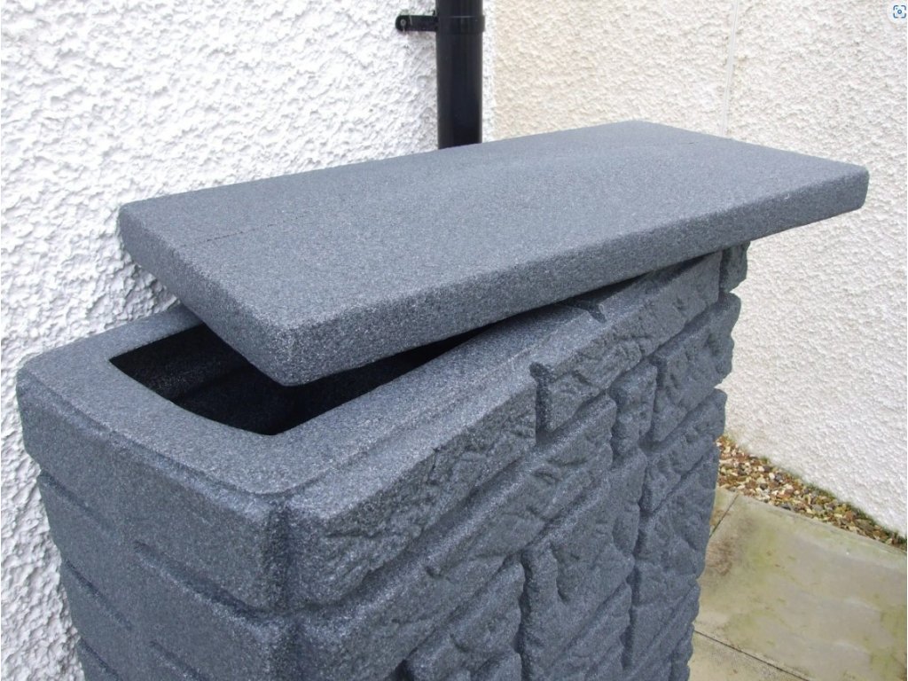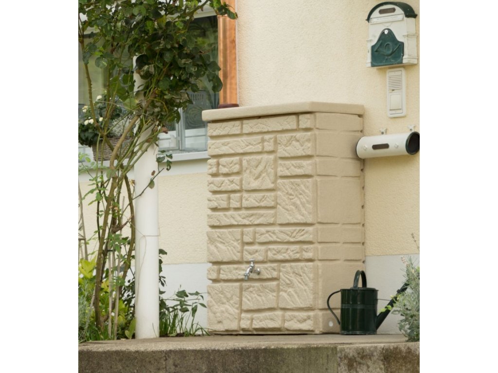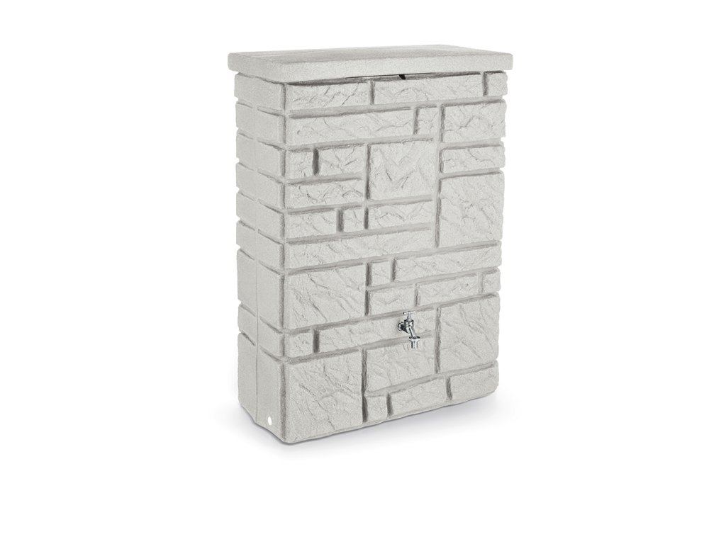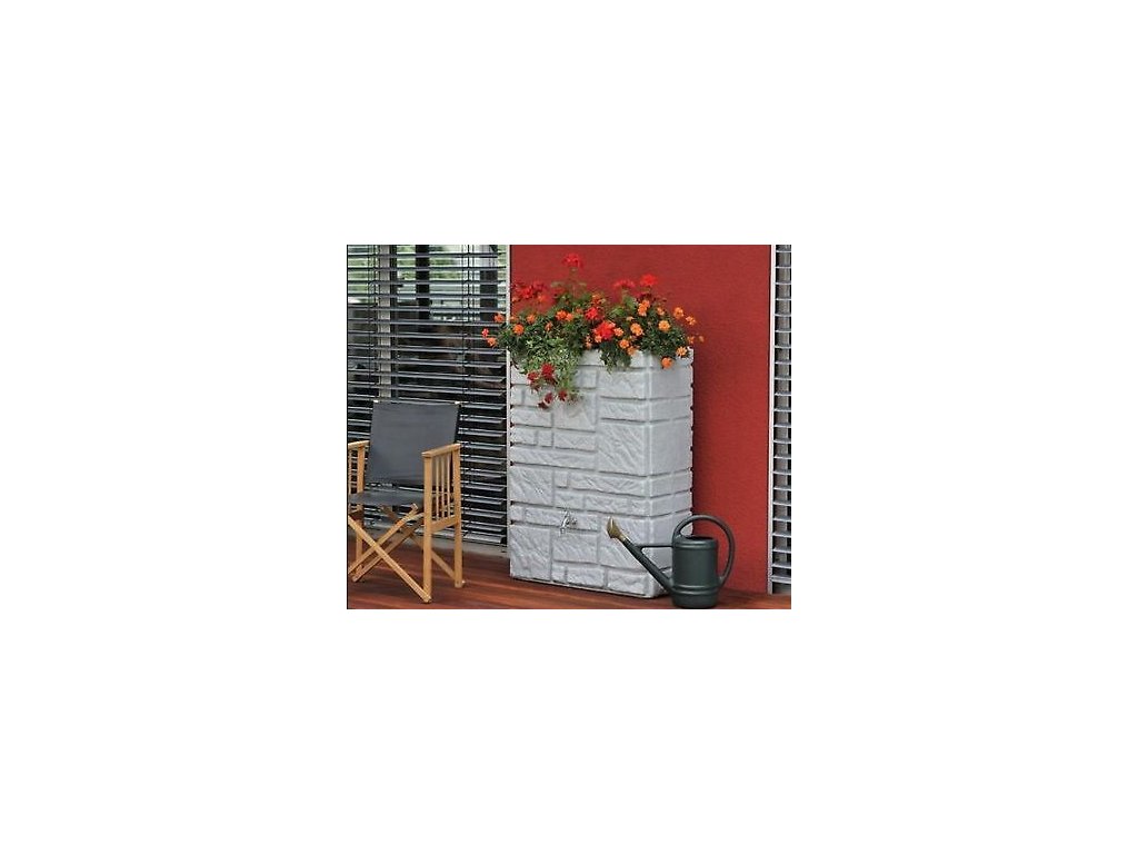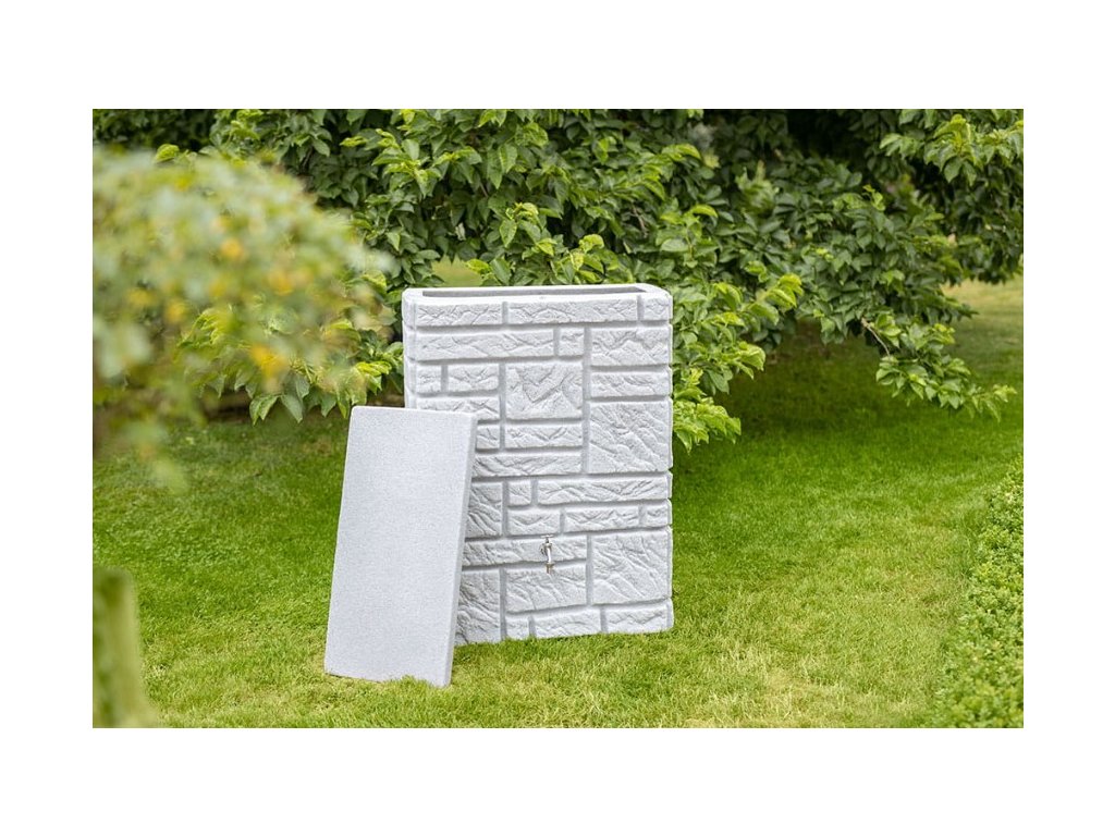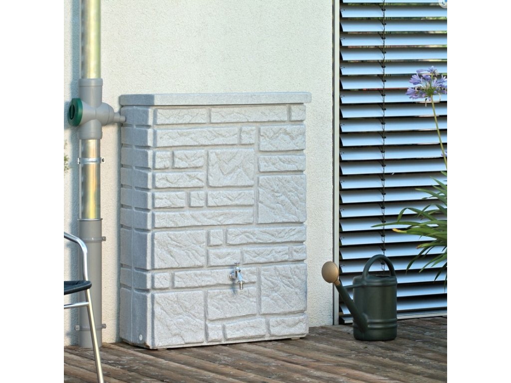 Moderní nádrž na dešťovou vodu Maurano je dekorativní nádrž, která vypadá jako zeď z přírodního kamene. Volitelně lze na tuto nádrž vysadit květiny, podle ročního období. Záhon je umístěn pod snímatelným krytem a vegetační miska je odnímatelná, což velmi usnadňuje její výsadbu. Nádrž je vyrobena z kvalitního plastu, který je odolný vůči povětrnostním vlivům. Největší předností této nádrže na vodu je její elegantní provedení, použité kvalitní materiály a především její praktičnost. Nádrž je na odnímatelném víku vybavena dětskou pojistkou a ve své spodní části je osazena otvorem s 3/4" mosazným závitem pro napojení kohoutku ITAP(není součástí balení). Okap s nádrží lze jednoduše propojit pomocí spojovacího systému Waterform Icanset, který zakoupíte v našem e-shopu. Nádrž má také dva boční odtoky kousek od země pro napojení hadice na vodu, nebo pro úplné vypuštění nádrže. Konstrukčně je tento typ sudu tzv. foukán, aby byl na rovném povrchu dobře stabilní a tudíž není potřeba podstavce. Kamenný vzhled se skvěle hodí do moderních interiérů a zahrad v souladu s trendy v současné architektuře.